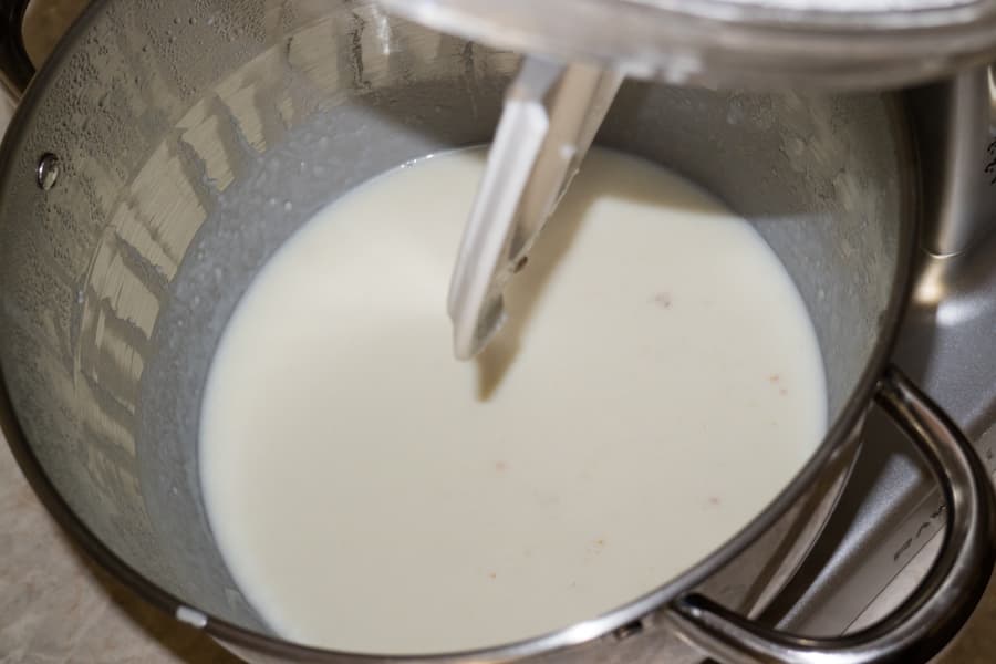Когда мука приобрела золотистый цвет, начали медленно вливать молоко. Увеличили скорость работы до четвертой, а температуру до 90 °C. Прибор продолжал подогревать дно дежи и вращать лопатку. Когда все молоко равномерно перемешалось с яично-масляной смесью, перевели прибор на работу со скоростью −1 (равномерно медленное перемешивание). Варили до загустения и готовности соуса. Всего миксер работал в данном эксперименте 17 минут.