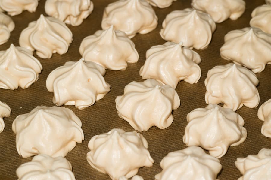 Подсушивали примерно в течение часа в режиме конвекции на 100 °C. Затем уменьшили температуру до 80 °C и держали меренгу в духовке еще один час. Готовые безе стали красивого кремового цвета, с плотной блестящей поверхностью, хрупкие и тающие во рту — идеальные легкие во всех смыслах пирожные к чаю или кофе.