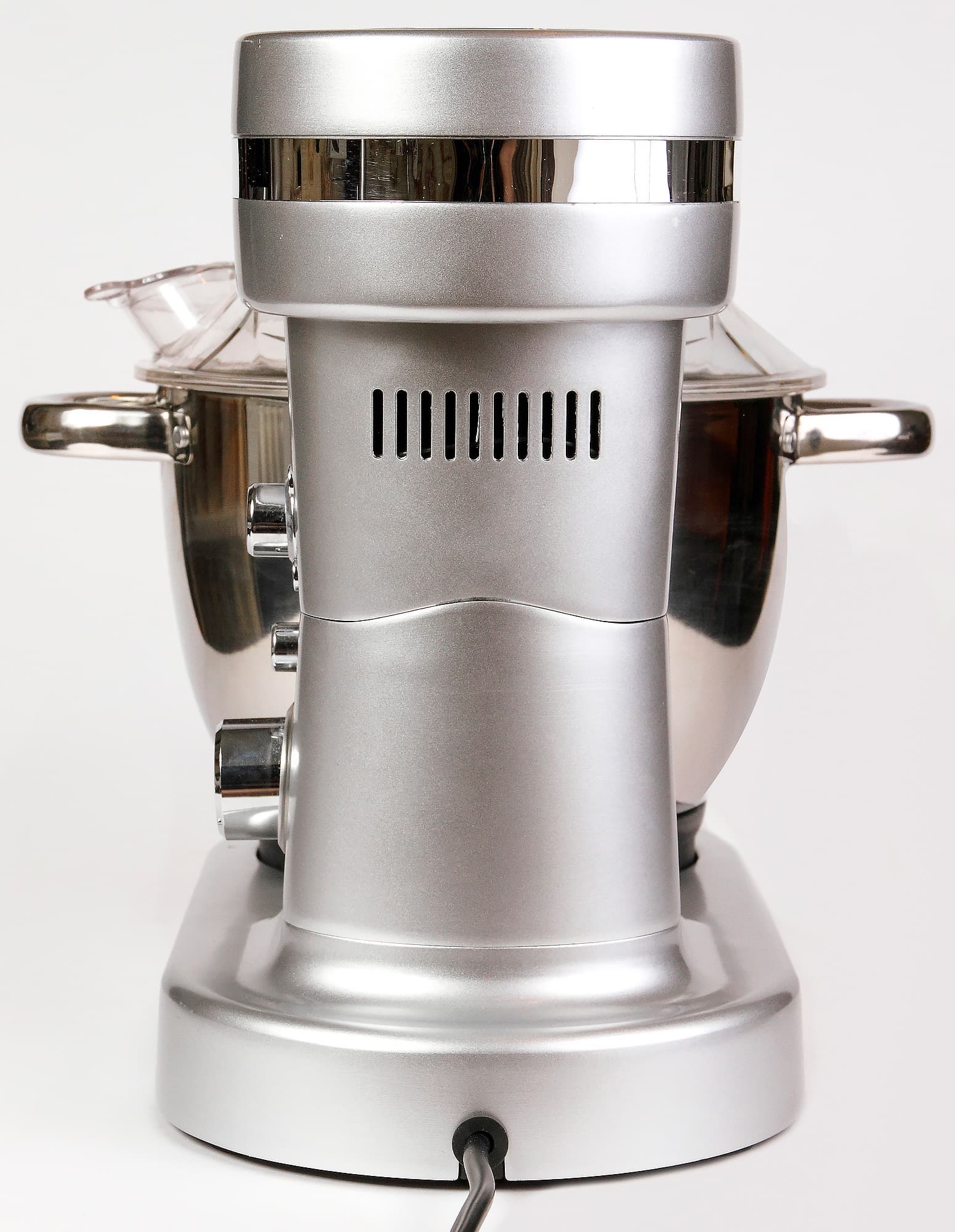 Как у всех «серьезных» планетарных миксеров корпус Rawmid RLM-05 довольно внушителен по габаритам и весу. Для этого прибора пользователю придется выделить место для эксплуатации и хранения. Вообще, и по размерам, и по функционалу прибор справедливо претендует на центральное место на кухне. Корпус выполнен из нержавеющей стали и пластика. Конструкция его стандартна: основание в левой части, где фиксируется дежа, откидная головка со шпинделем для установки насадок и двумя разъемами, закрытыми защитными крышками, для установки дополнительных насадок, панель управления с дисплеем, регуляторами и кнопками справа на фронтальной стороне.