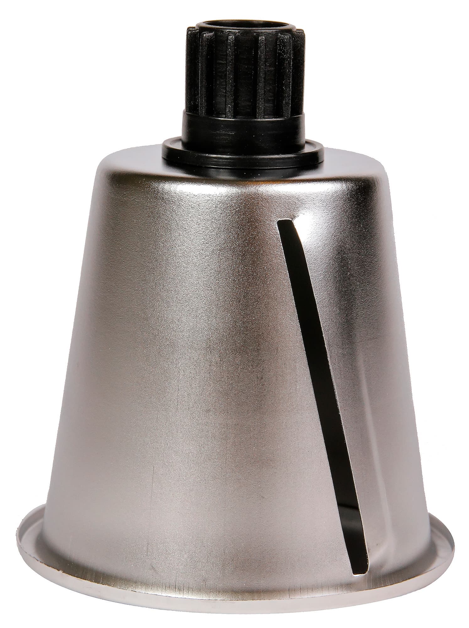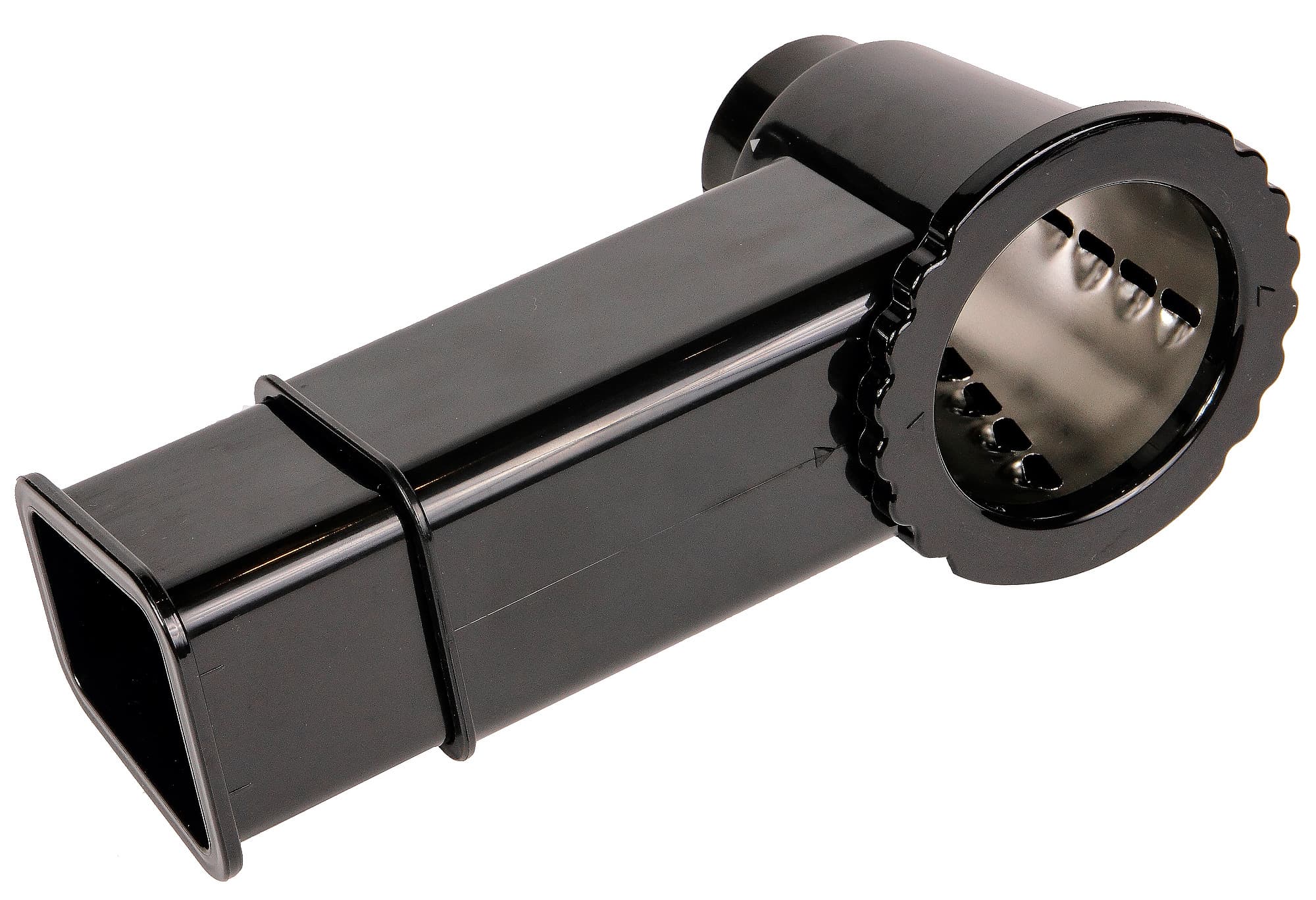 Загрузочное отверстие в данной насадке не такое крупное как в корпусе терки, поэтому продукты приходится разрезать на кусочки, которые могут свободно поместиться в раструб и попасть на режущие детали дисков.