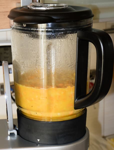 Уменьшили температуру до 100 °C, добавили в воду обрезки картофеля из одного из тестов и натертую морковь из другого теста. Скорость уменьшили до −2. Через некоторое время суп начал бурлить очень сильно, снизили нагрев до 98 °C — бурление уменьшилось, суп начал потихоньку кипеть. Через 10 минут кипения добавили цветную капусту. Продолжали варку 5-7 минут после закипания. По окончании запустили блендер на шестой скорости на десяток секунд, чтобы получить более однородную текстуру супа-пюре.