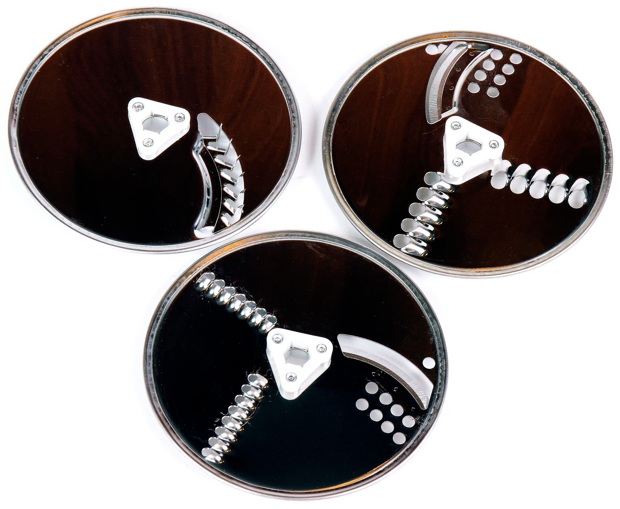 - кухонный комбайн: чаша измельчителя, S-образное лезвие измельчителя, крышка с загрузочной горловиной, толкатель, три диска для нарезки и шинковки: мелкая и крупная терки, нарезка соломкой; насадка-соковыжималка: сито, разъем соковыжималки, большая и маленькая соковыжималки
