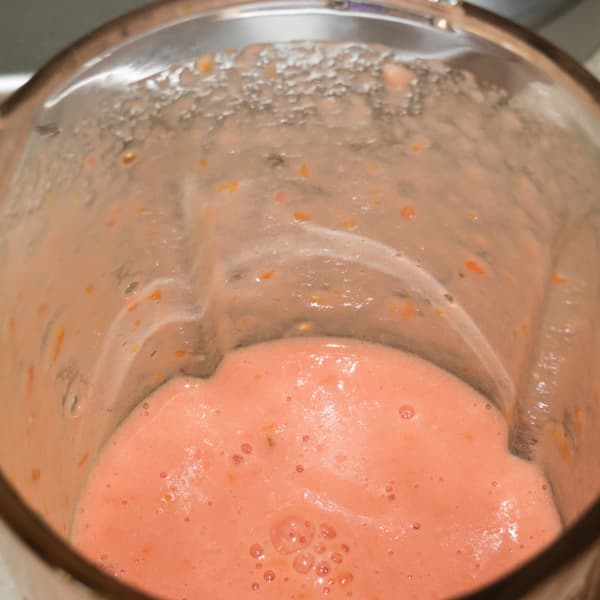 Начали измельчение с пятой скорости. За 30 секунд помидоры превратились в густой взбитый томатный сок. Продолжили работу еще в течение 30 секунд на максимальной скорости. За минуту масса стала легкой, наполненной воздухом, в ней не встречается ни единого крупного фрагмента томата. Косточки не измельчились, также видны кусочки шкурки.