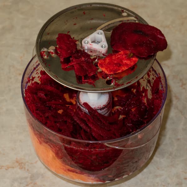 На крупной терке измельчали морковь и свеклу. Всего вес овощей составил 310 г. Прибору потребовалось 30 секунд работы на пятой скорости. Овощи натерты ровными крупными фрагментами. Отходов не так много — буквально три необработанных кусочка. Причем в этом тесте выяснилась интересная деталь. Диаметр дисков меньше диаметра чаши, поэтому непрорезанные кусочки могут попадать в емкость сквозь щели между кромкой диска и стенкой чаши. На фотографии два кусочка свеклы, лежащие на диске слева, как раз вот такие, сбежавшие от ножей в щели.