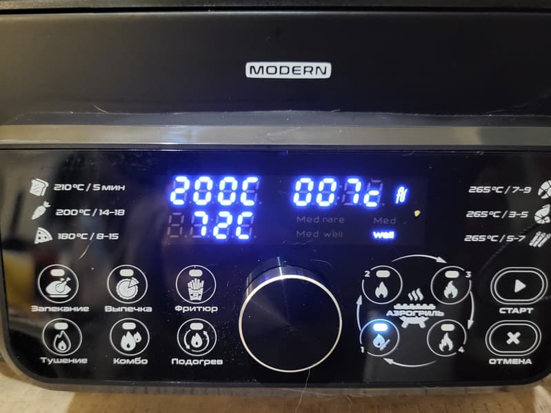 200 °C— это температура, до которой разогревается аэрогриль, 65 °C — это температура внутри куска мяса, которой мы хотим добиться, о чем также информирует и надпись Med well, а «015с» — это что? Горящий значок термощупа не вполне отвечает на этот вопрос. Может быть, это время в секундах, за которое приготовится мясо? Или же что-то другое?