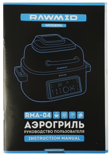 Инструкция к аэрогрилю Rawmid RMA-04 напечатана на 26 страницах формата А5 на плотной глянцевой бумаге. В ней описывается сам прибор, есть таблица с описанием режимов работы, возможных температур, времени и настроек по умолчанию. В другой таблице указаны параметры режимов работы с термощупом, а далее даются рекомендации по температуре, подходящей для разного типа продуктов. Традиционно в инструкции дается техническая информация, рассматривается устранение неполадок и проблем при готовке. Инструкция написана понятным и ясным языком, но хотелось бы более подробного описания работы с термощупом, поскольку в инструкции, увы, никак не указано, к какому конкретно месту в приборе его необходимо подключать, а рекомендации по температуре приготовления продуктов с термощупом даны только для стейков разной степени прожарки.