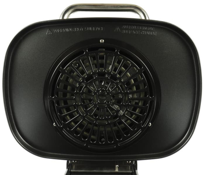 Нагревательный элемент находится в крышке прибора, и если увеличить фото, то можно увидеть, что он имеет спиралевидную форму, обеспечивающую, по утверждению производителя, широкий охват пространства и быстрый прогрев воздуха. Защитную решетку, защищающую нагревательный элемент от брызг, в случае необходимости можно снять и вымыть отдельно.