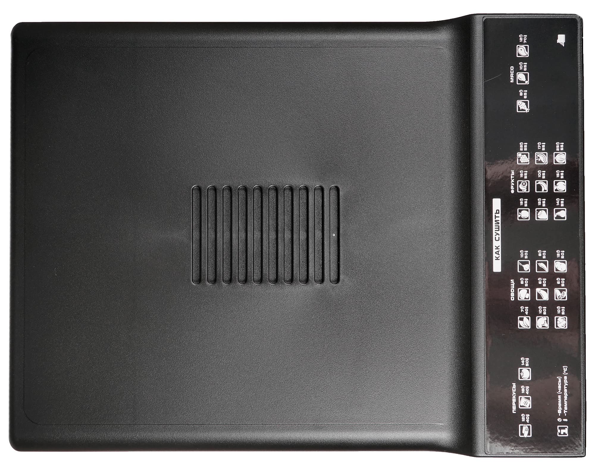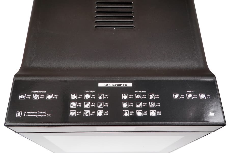 Весьма уместны и полезны подсказки по сушке, нанесенные на верхней панели корпуса. Схематические изображения продуктов легко идентифицируются, краткая информация оказывается достаточной для того, чтобы сориентироваться, какие условия требуются для сушки определенных видов сырья.