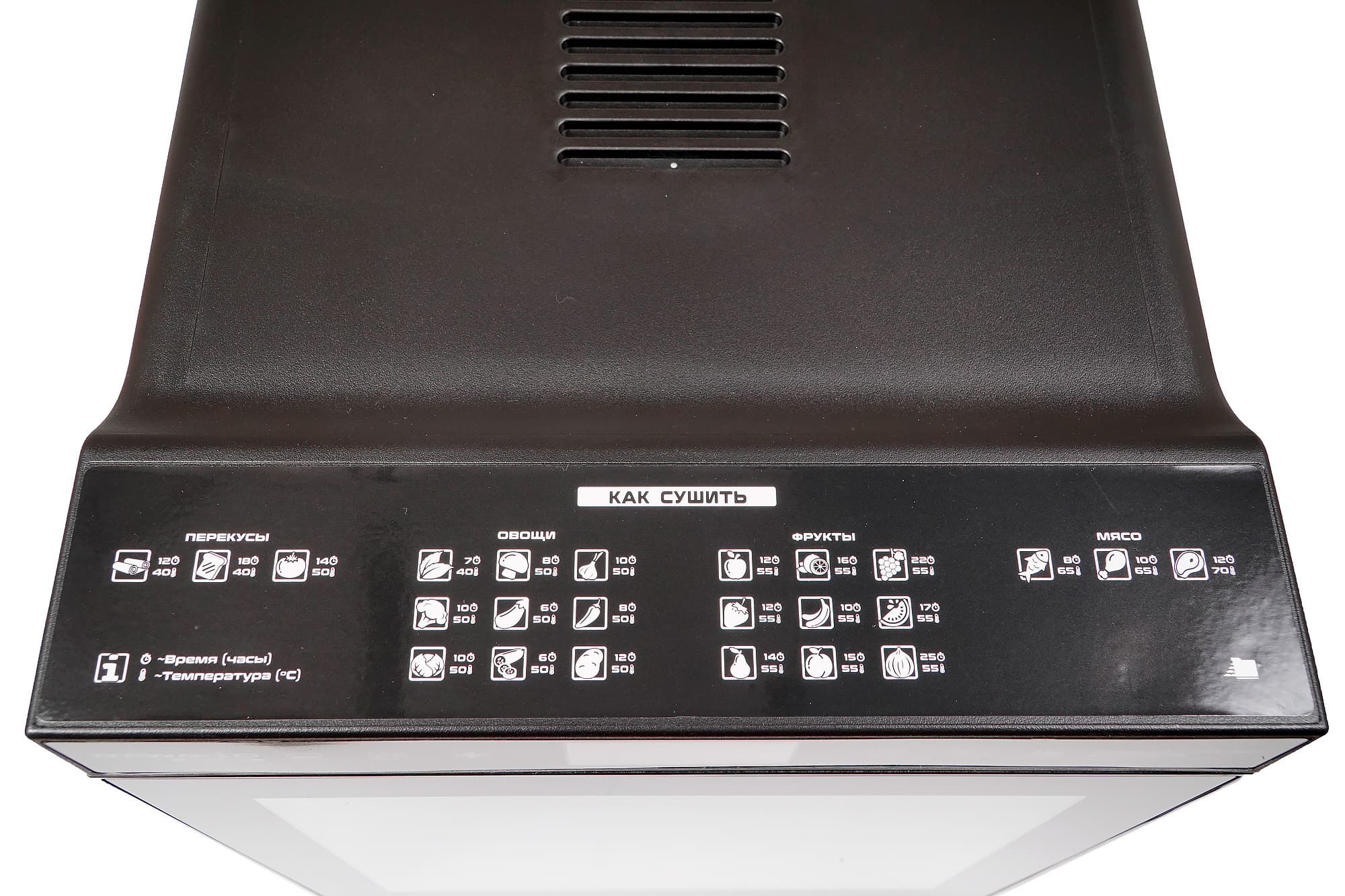- наглядные подсказки по температуре и продолжительности сушки разных продуктов