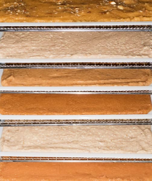 Сплошные поддоны слегка смазали растительным маслом и выложили измельченные фрукты. В среднем на лоток помещалось 530-550 г пюре. Таким образом, в полностью загруженном дегидраторе можно единовременно переработать около пяти килограммов фруктов (9×550).