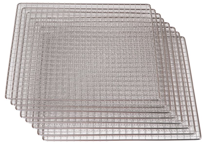 В комплект к дегидратору входят 10 металлических лотков с размером ячеек 11×11 мм, 9 пластиковых решеток с ячейкой 4×4 мм и 9 сплошных поддонов с бортиками высотой 5 мм. Лотки изготовлены из нержавеющей стали и предназначены для сушки цельных или крупно нарезанных продуктов.