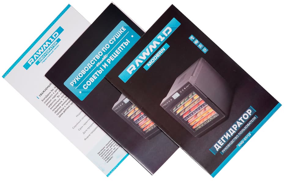 В 14-страничной инструкции рассказывается о правилах эксплуатации и мерах безопасности при взаимодействии с дегидратором. Некоторые разделы сопровождаются цветными фотографиями. Подробно и внятно описан процесс управления и установки как произвольных настроек, так и использование встроенных автоматических программ. Инструкция небольшая, сведения преподносятся в логичном порядке и простым языком, так что на изучение документа достаточно и пяти минут. Разделы, освещающие подготовку и хранение продуктов, очень краткие, дают лишь общее представление о процессах. Таким образом, незаменимым помощником, в особенности для неопытного кулинара, становится вторая брошюра — «Руководство по сушке Rawmid. Советы и рецепты».