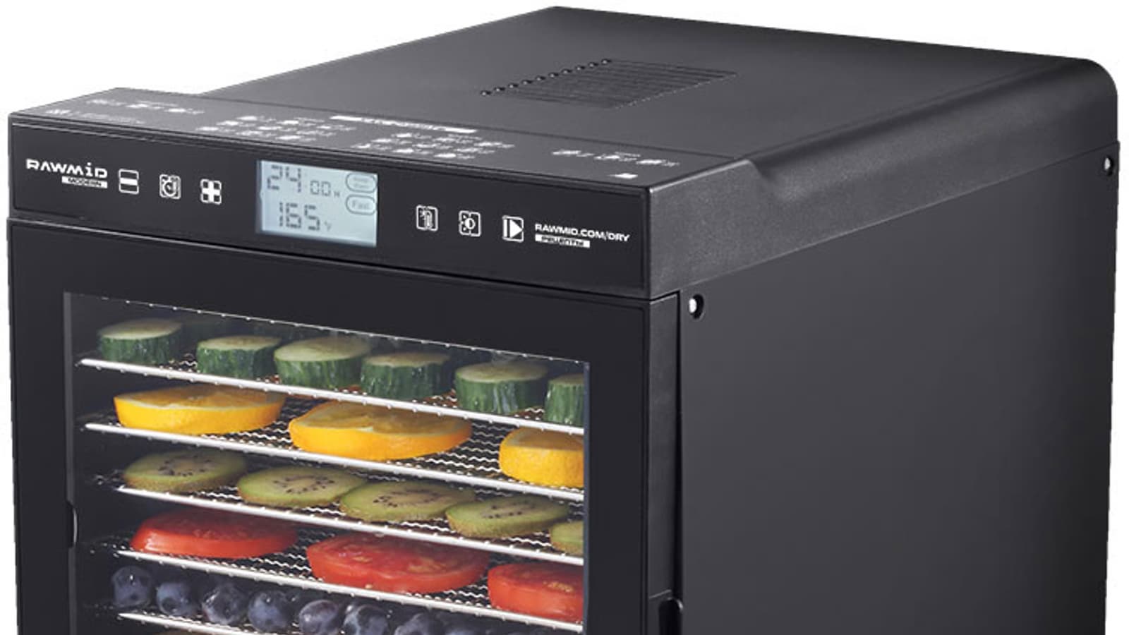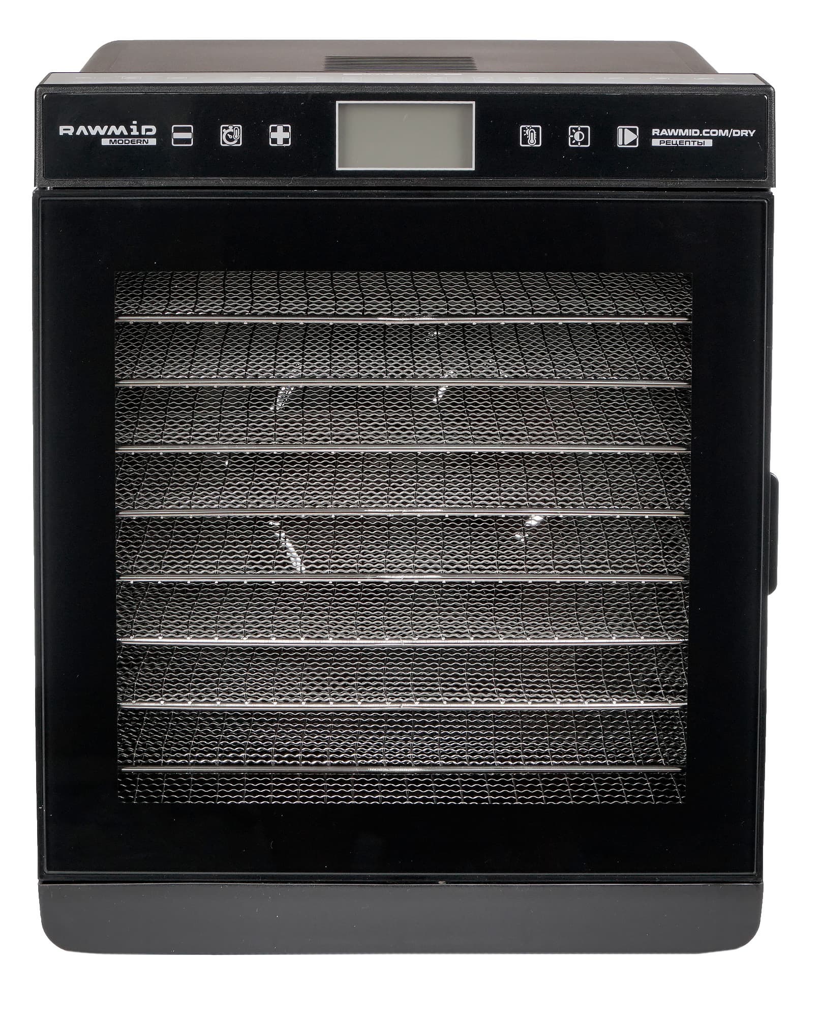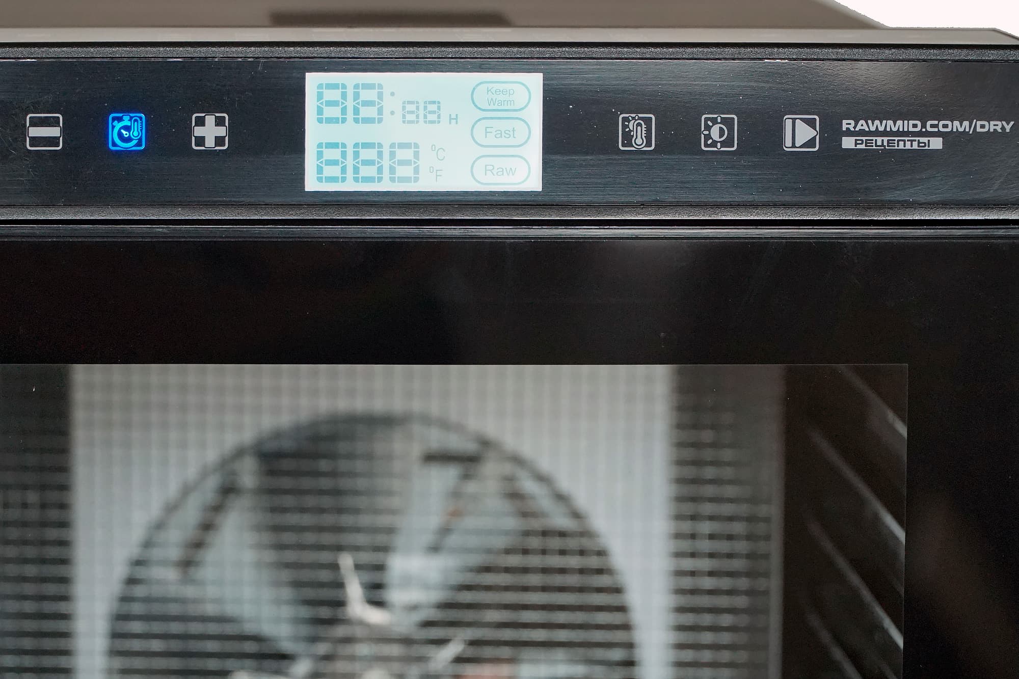 Так что управление дегидратором Rawmid Modern RMD-10 очень простое. На дисплее отражается установленная температура и время, оставшееся до окончания работы. Оба параметра можно регулировать хоть в большую, хоть в меньшую стороны в любое время. Как и все дорогие дегидраторы, наш подопытный оснащен таймером, отключающим работу по завершении времени.