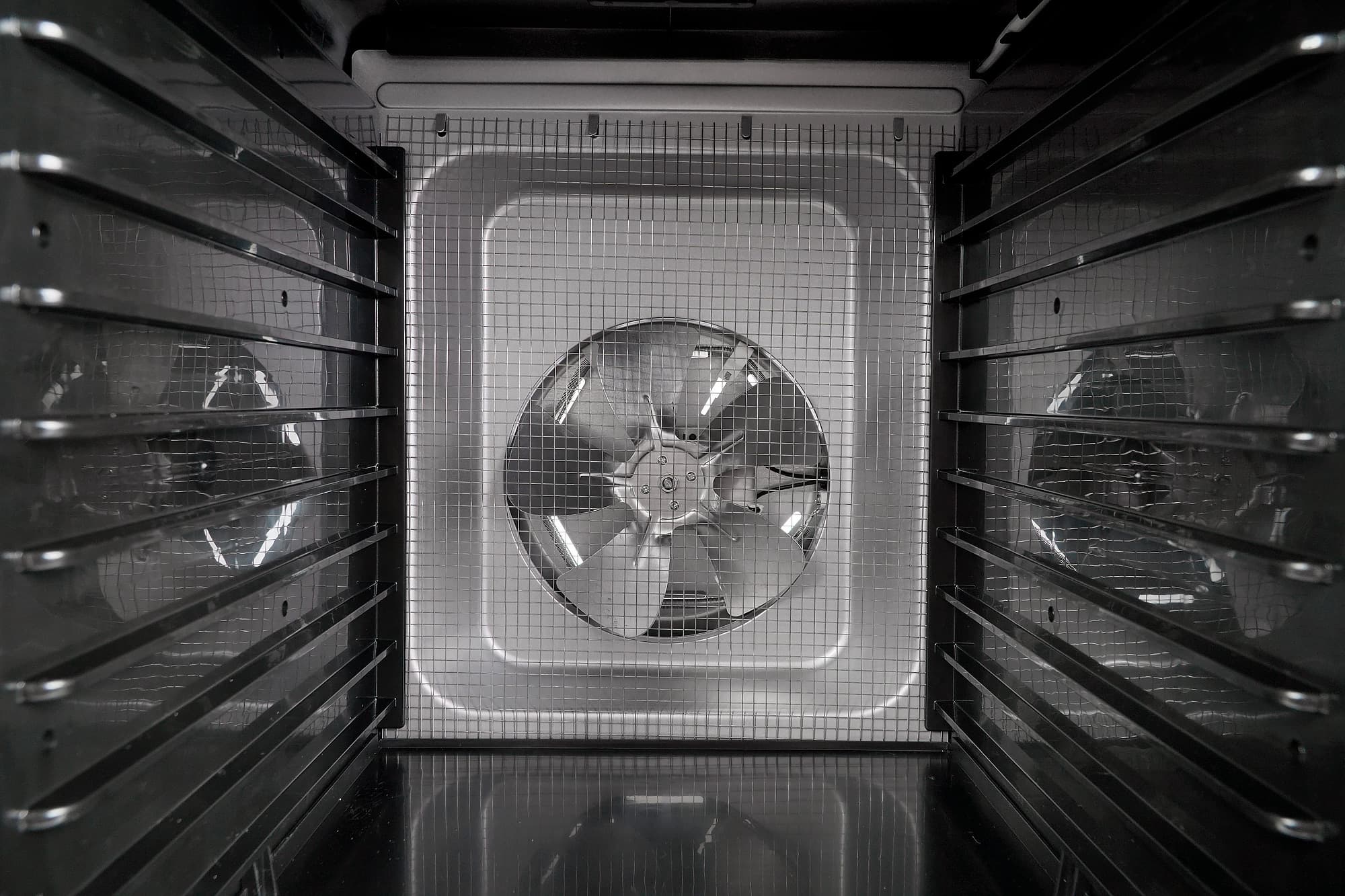 Осмотр внутренней камеры также не преподнес никаких сюрпризов. Десять направляющих для установки лотков на боковых сторонах камеры, гладкое дно и мощный крупный вентилятор, встроенный в заднюю панель. Вентилятор защищен металлической сеткой. За вентилятором почти по периметру лопастей размещен спиралевидный нагревательный элемент.