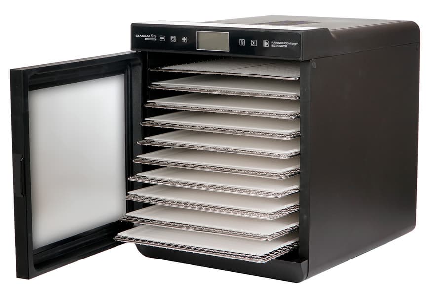 Дегидратор Rawmid Modern RMD-10 весьма комфортен в эксплуатации. Не сказать, что он компактен, но благодаря форме и количеству лотков, выход продукта оказывается довольно большим, потому что вся поверхность поддонов является полезной.