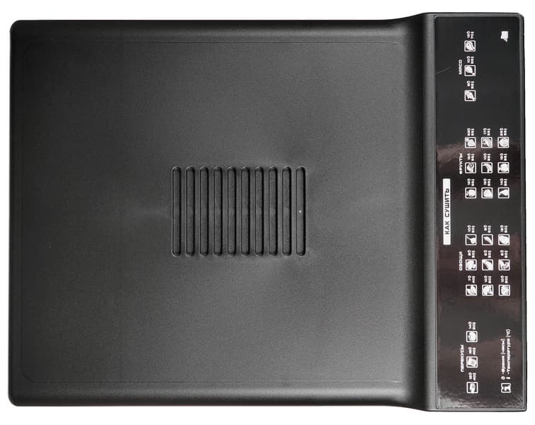 Внешне дегидратор Rawmid Modern RMD-10 представляет собой параллелепипед черного цвета. Такая форма кажется нам наиболее удачной, позволяющей сэкономить пространство и увеличить полезную площадь для сушки продуктов. Попавший на тесты прибор выполнен в черном цвете. Также можно приобрести дегидратор белого цвета. Боковые стороны имеют ровную поверхность. Матовый пластик не выглядит дешевым.