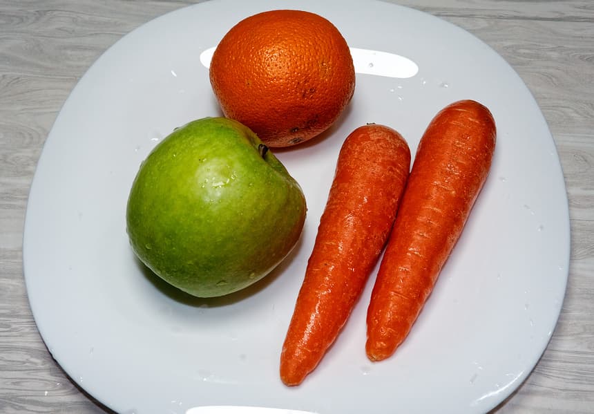 Для смузи мы взяли морковь, яблоки, а также мякоть апельсина (в качестве основного источника жидкости). Чтобы усложнить работу блендеру, воду мы решили не добавлять, а ингредиенты нарезать крупными кусками: яблоки и апельсины — на четвертинки, морковь — примерно по 1,5-2 см.