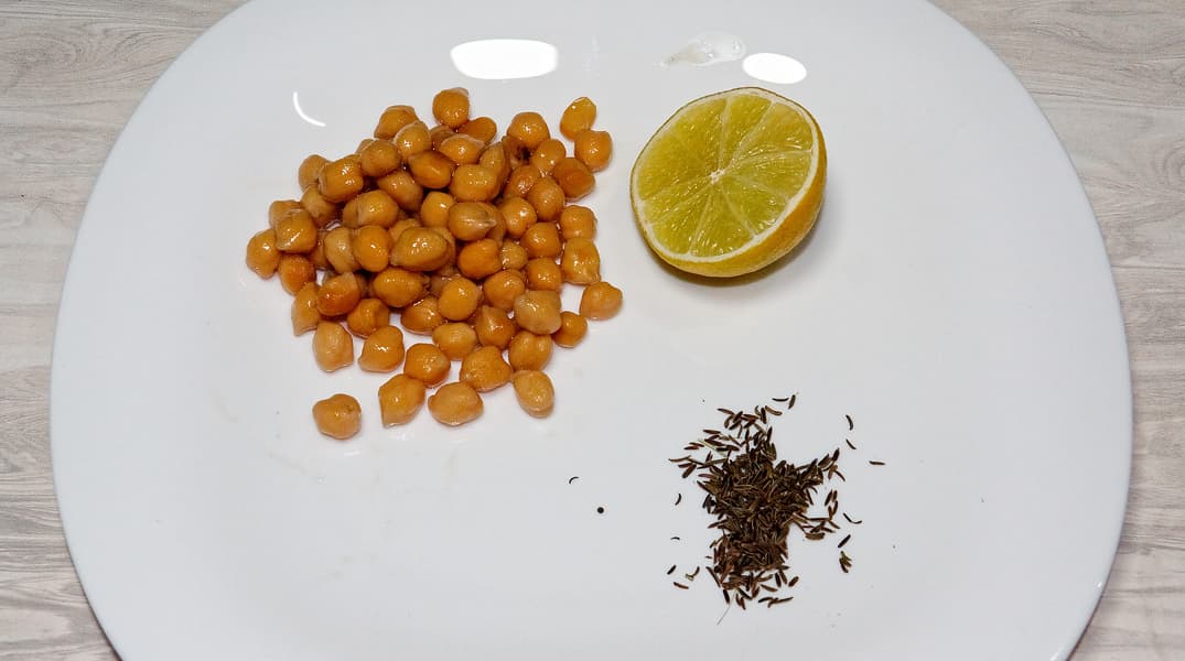 Для приготовления хумуса мы воспользовались классическим рецептом: замочили нут в холодной воде на ночь, на следующий день отварили в той же воде. Воду слили, оставив небольшой запас для добавления в блендер.