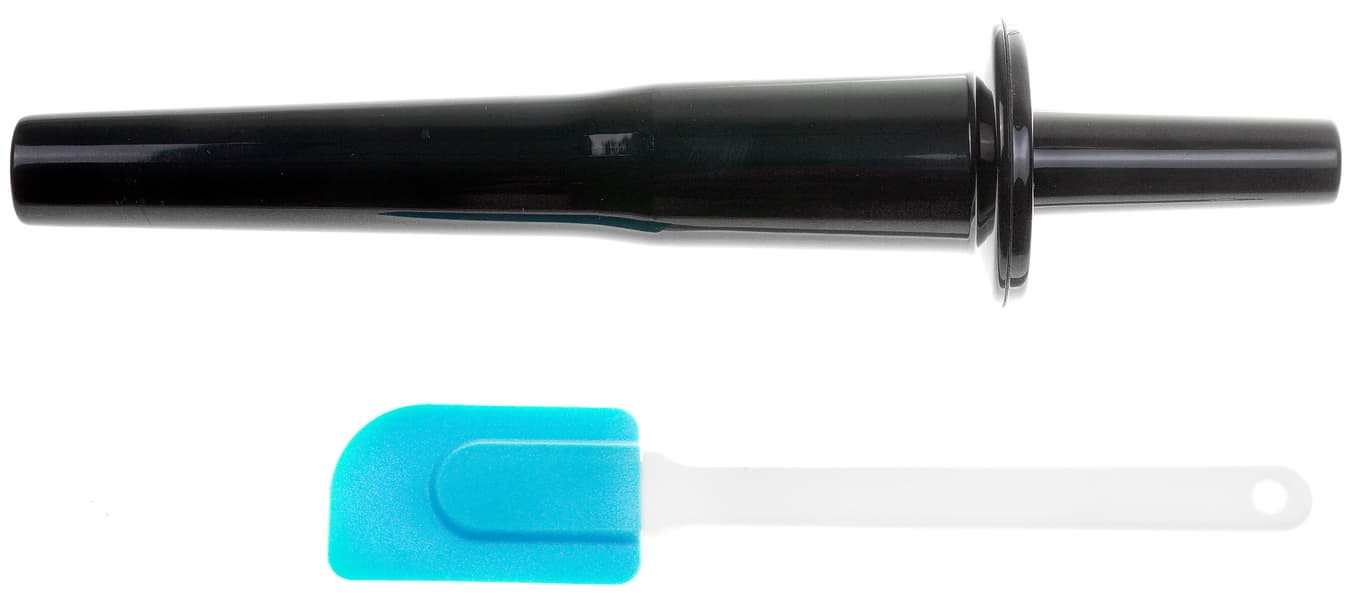 Пластиковый толкатель-перемешиватель и силиконовая лопатка — на наш взгляд, стандартные и обязательные аксессуары, которые должны быть в комплекте с каждым блендером. Толкатель снабжен ограничителем: если его использовать со штатной крышкой чаши, опуская через отверстие в ней, ограничитель не даст опустить толкатель так глубоко, чтобы его могли задеть ножи. Эта деталь выглядит, как мелочь, но в повседневном использовании комфорт от этой «мелочи» трудно переоценить: она позволяет во время работы блендера орудовать толкателем внутри чаши легко и уверенно, ничего не боясь.