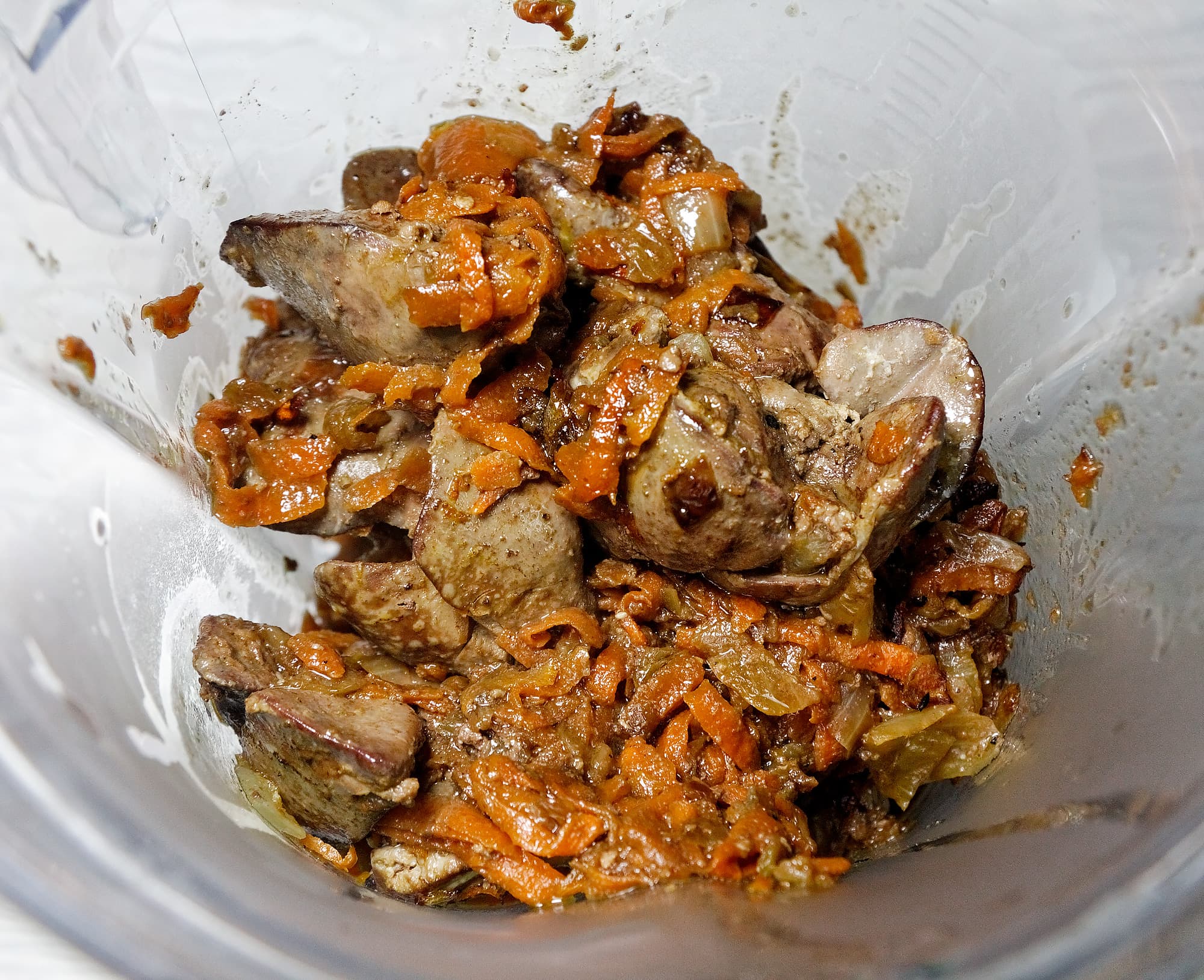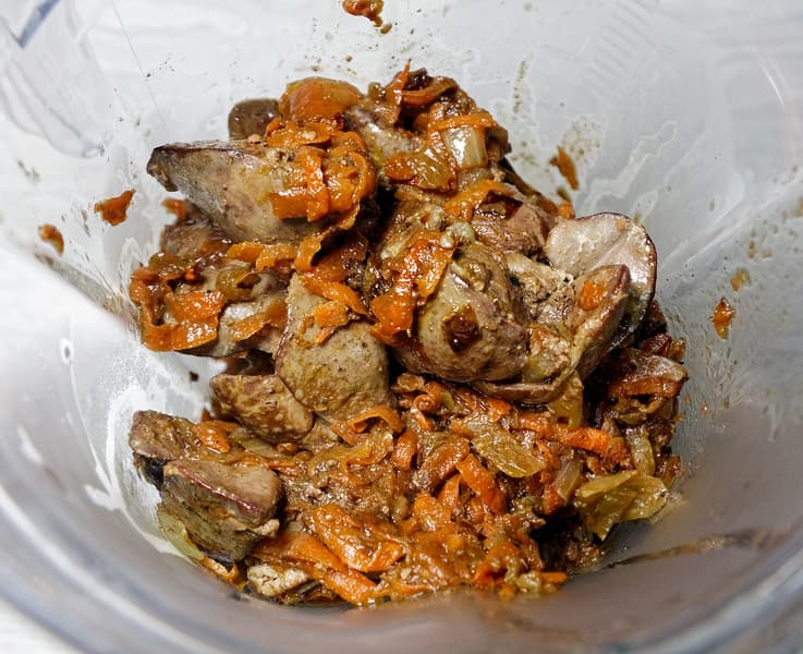 Обжарили на растительном масле репчатый лук и натертую морковь, потушили куриную печенку. Остудили, добавили соль и черный перец, сливочное масло и сливки.