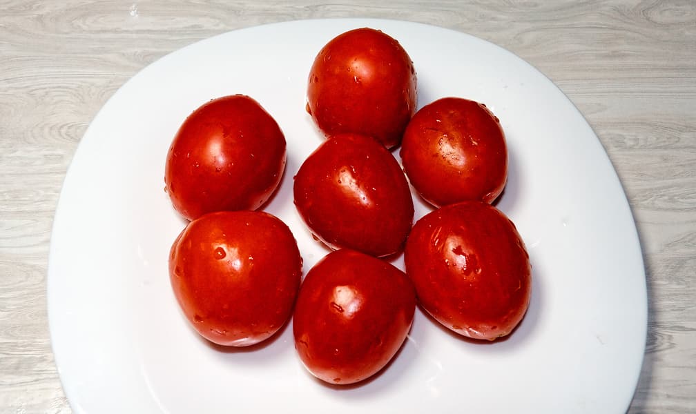 Для теста мы взяли около килограмма помидоров с достаточно жесткой и толстой шкуркой. Помидоры были разрезаны на 2-4 части, плодоножка удалена.