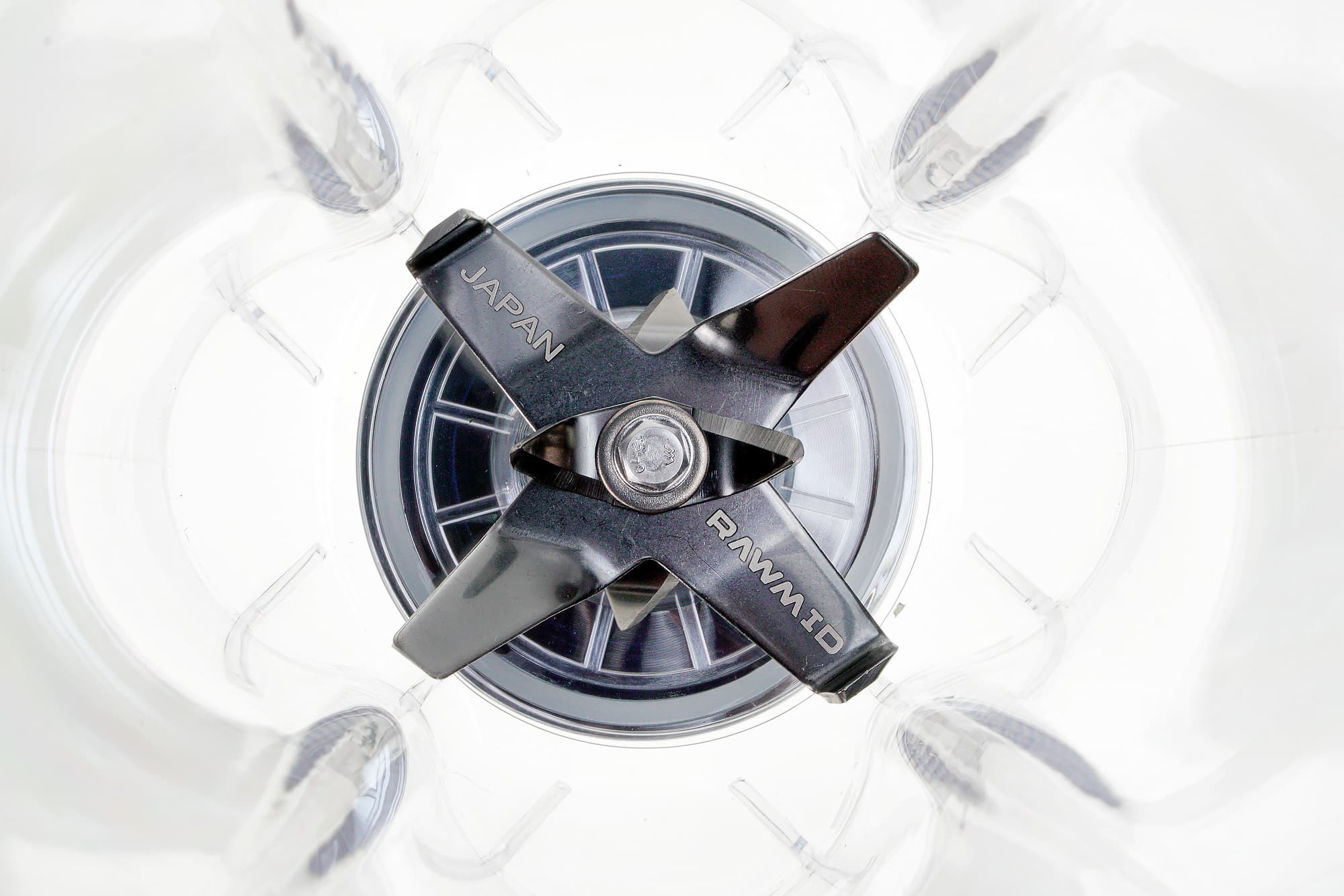 У блендера есть две пары мелких ножей, попарно загнутых вверх и вниз, а также большой четырехлопастной нож, лопасти которого загнуты вверх. Очевидно, крупный нож предназначен для измельчения более крупных кусков продуктов, после чего за дело берутся мелкие (более острые) ножи.