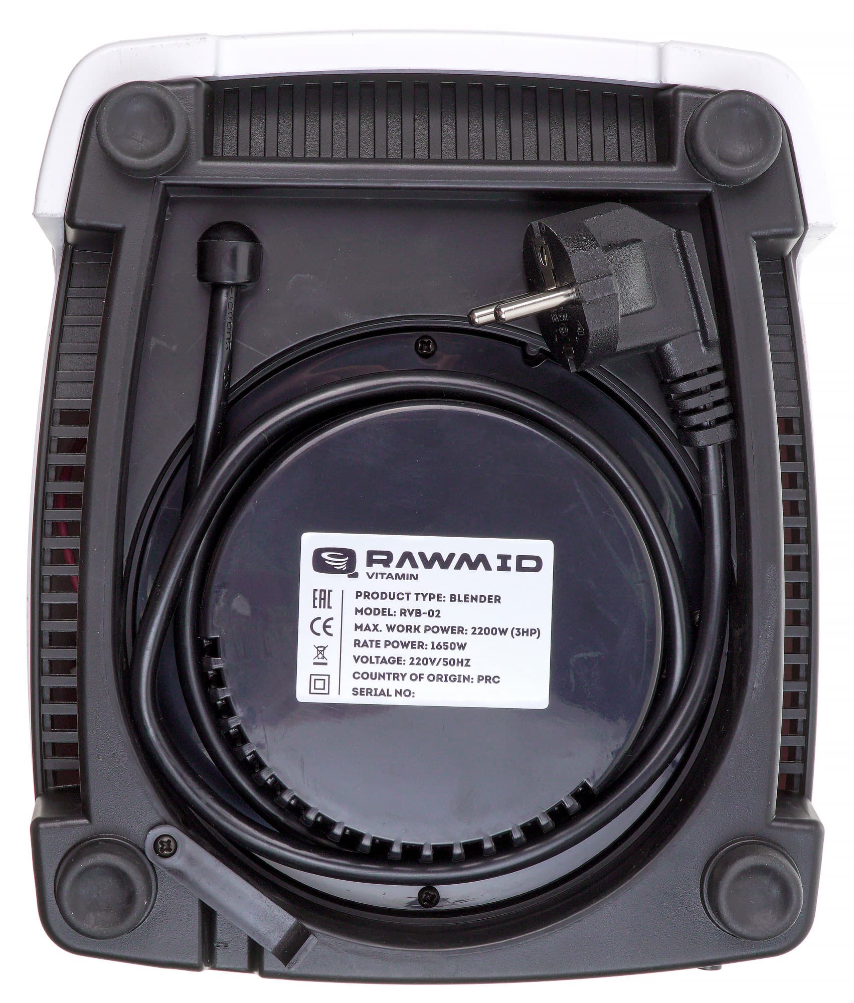 Корпус моторного блока сделан из белого глянцевого пластика. Снизу можно увидеть вентиляционные отверстия, наклейку с технической информацией, резиновые ножки и отсек для хранения шнура. Помимо места для намотки шнура тут также присутствует клипса, закрепляющая шнур в месте выхода из корпуса, так что о том, что излишки шнура случайно размотаются, можно не беспокоиться.