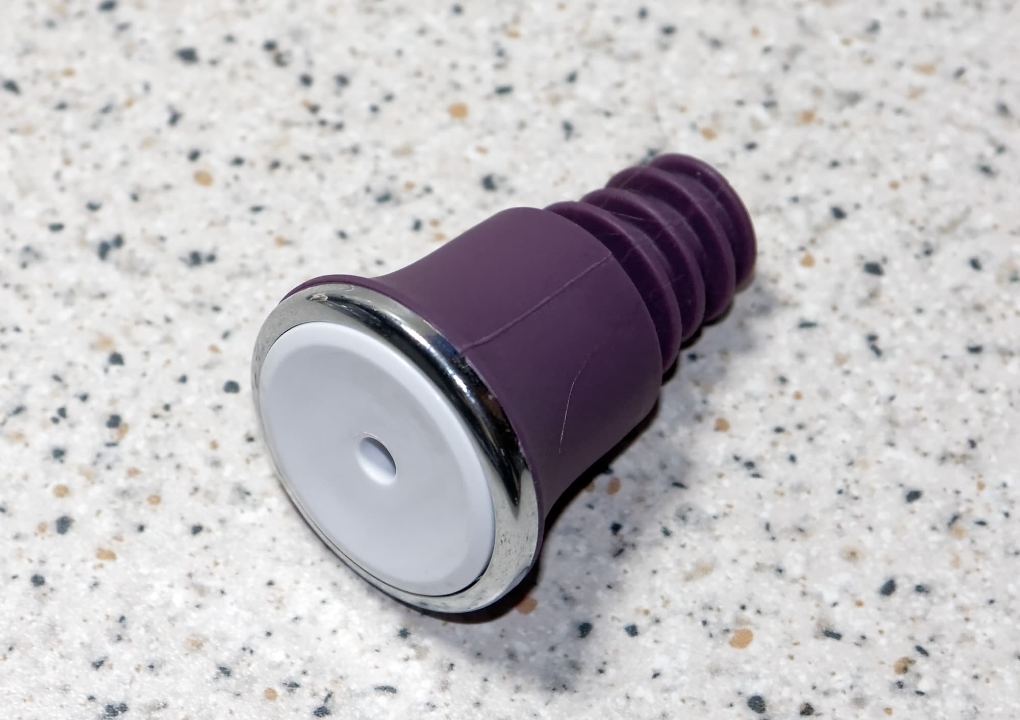 Основной материал, из которого сделана пробка — это резина. Пробка имеет пластиковую верхнюю заглушку, под которой прячется вакуумный клапан. Снизу расположены концентрические кольца с диаметром от 1 до 2 см, позволяющие использовать пробку с бутылками с разным диаметром горлышка.