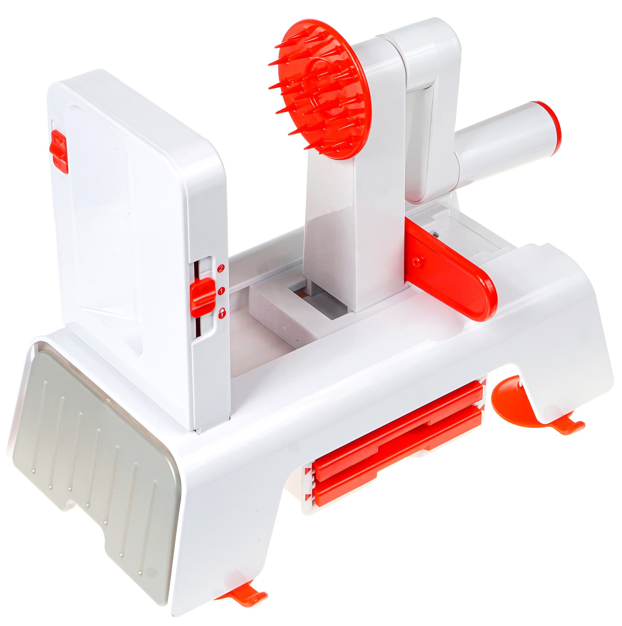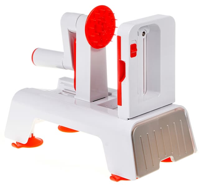В собранном виде спиралерезка невелика и занимает чуть меньше места, чем обычная разделочная доска средних размеров. Яркая и нарядная, она наверняка привлечет внимание детей. Однако острота ножей делает устройство весьма серьезным — и совершенно точно детям ее давать не стоит даже под бдительным присмотром родителей.