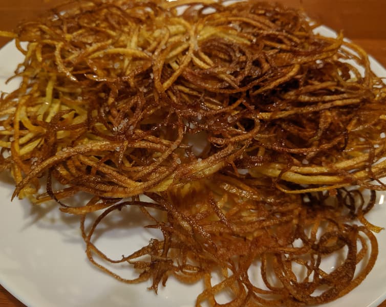 Нарезка картофеля дала нам длинные тонкие «макаронины», которые мы с большим удовольствием обжарили в большом количестве растительного масла и с аппетитом съели. В отличие от обычной нарезки для фри, такая картошка прожаривается целиком, хрустит и вполне заменяет — даже без специй — магазинные чипсы. Единственная оплошность, которую можно допустить, — пересолить.
