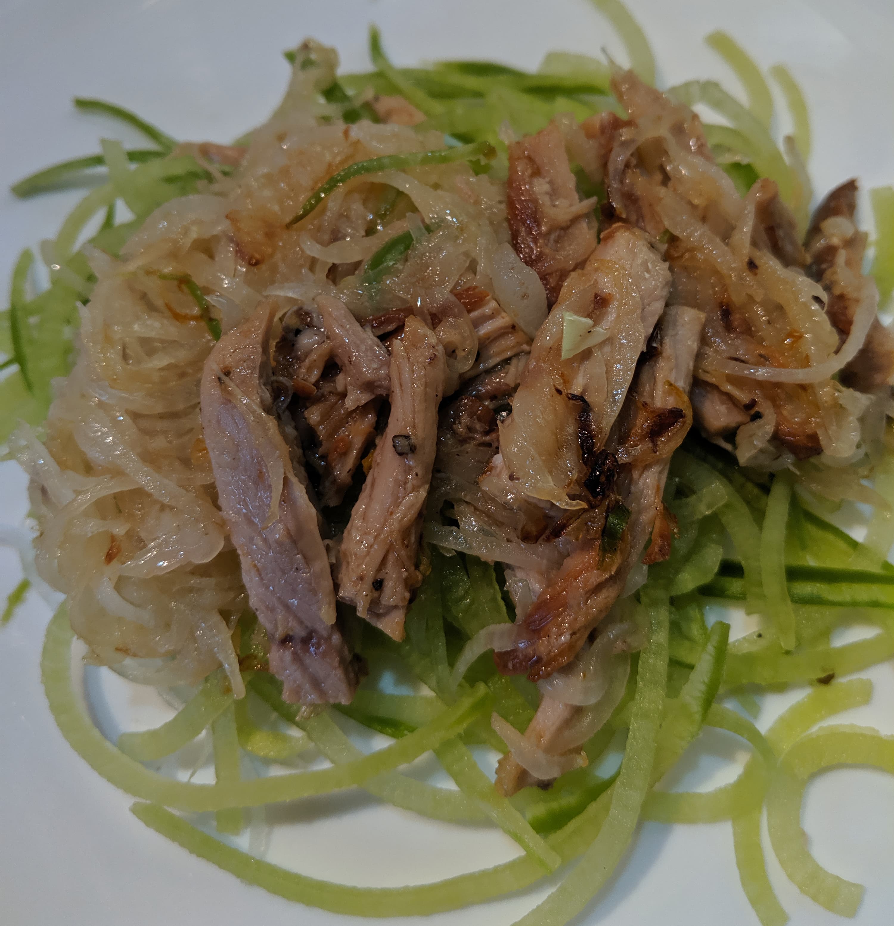 Длинные спагетти из редьки надо нарезать на более короткие кусочки для удобства. На той же спиралерезке нарезать перьями репчатый лук, обжарить его на растительном масле до карамелизации и горячим маслом вместе с луком залить редьку. Положить в салат разобранное на волокна или тонко нарезанное брусочками куриное мясо (это придется делать отдельно), перемешать и подавать на стол.