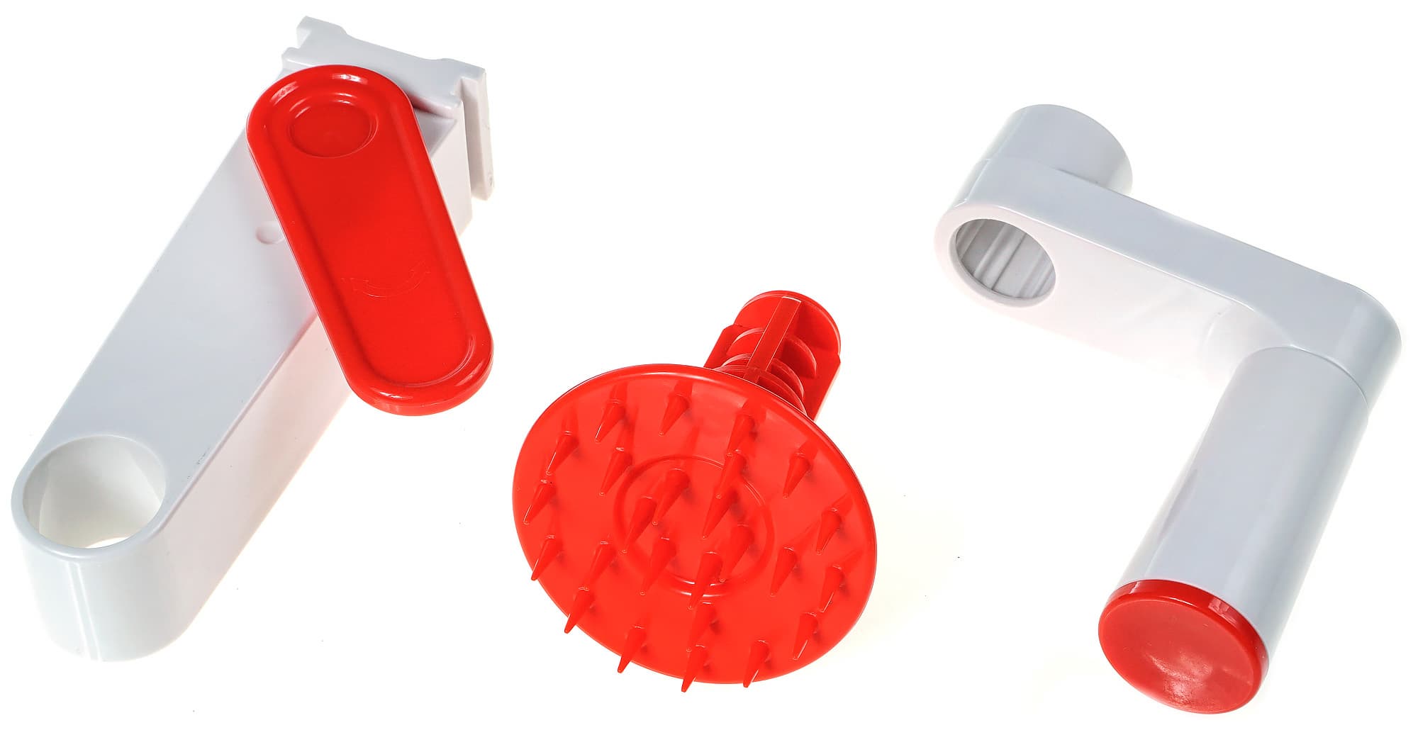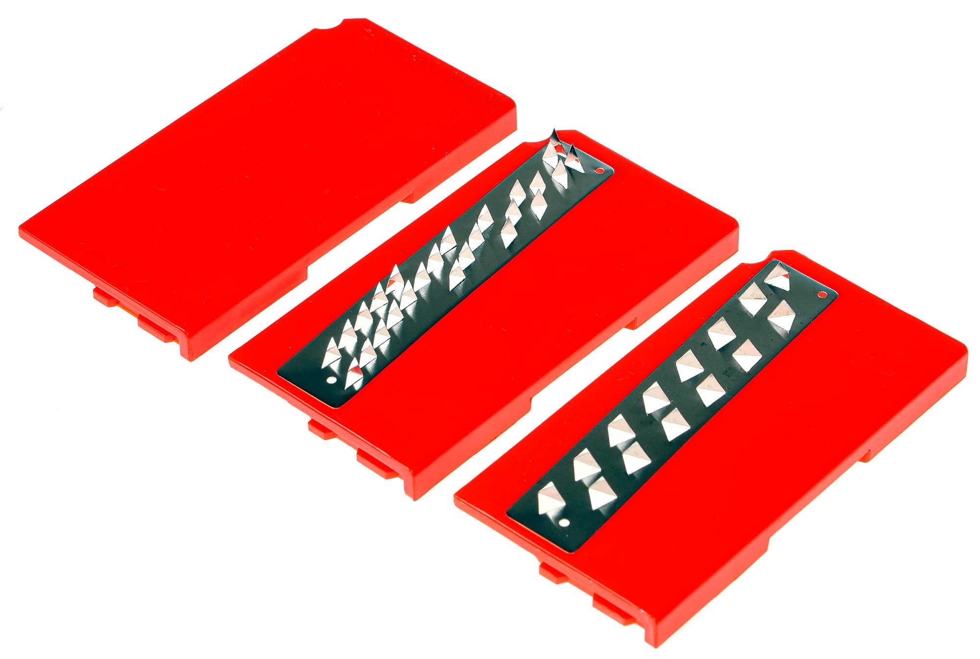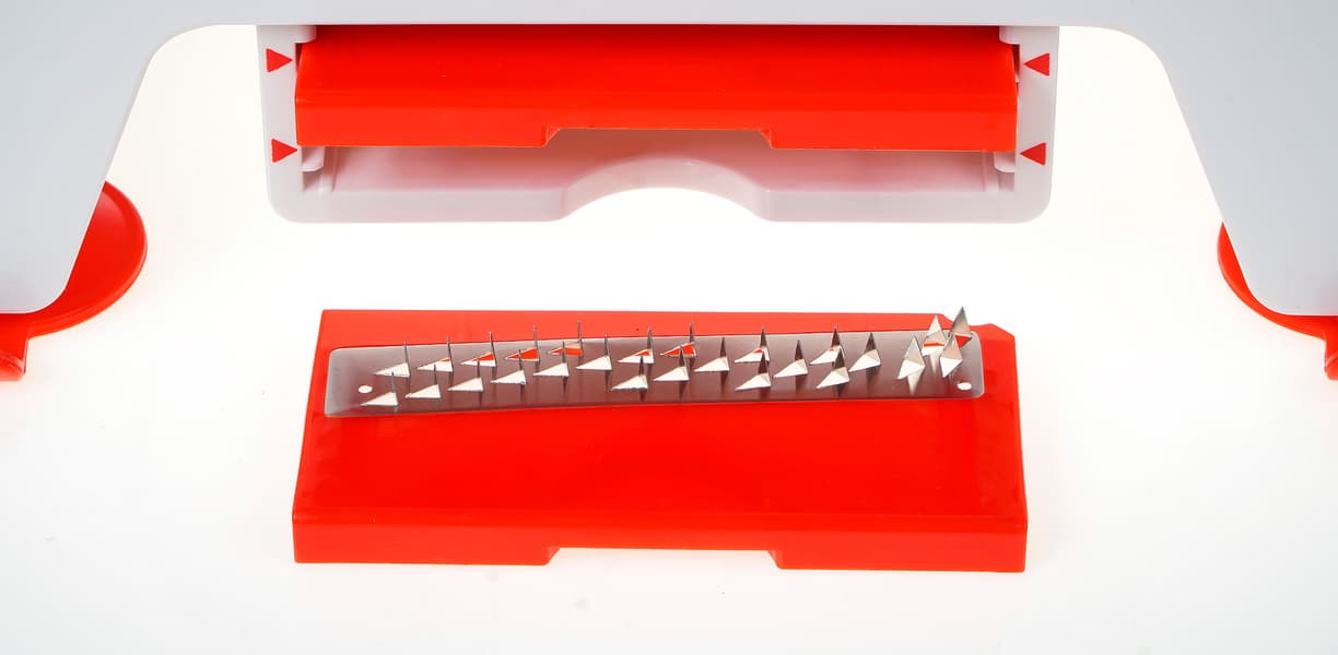 В ножевую панель также можно вставить два сменных ножа. Это пластины из красного пластика с системой лезвий, которые позволяют нарезать из продукта тонкие «спагетти» или более широкую «лапшу». Итого для пользователя доступны шесть сочетаний: