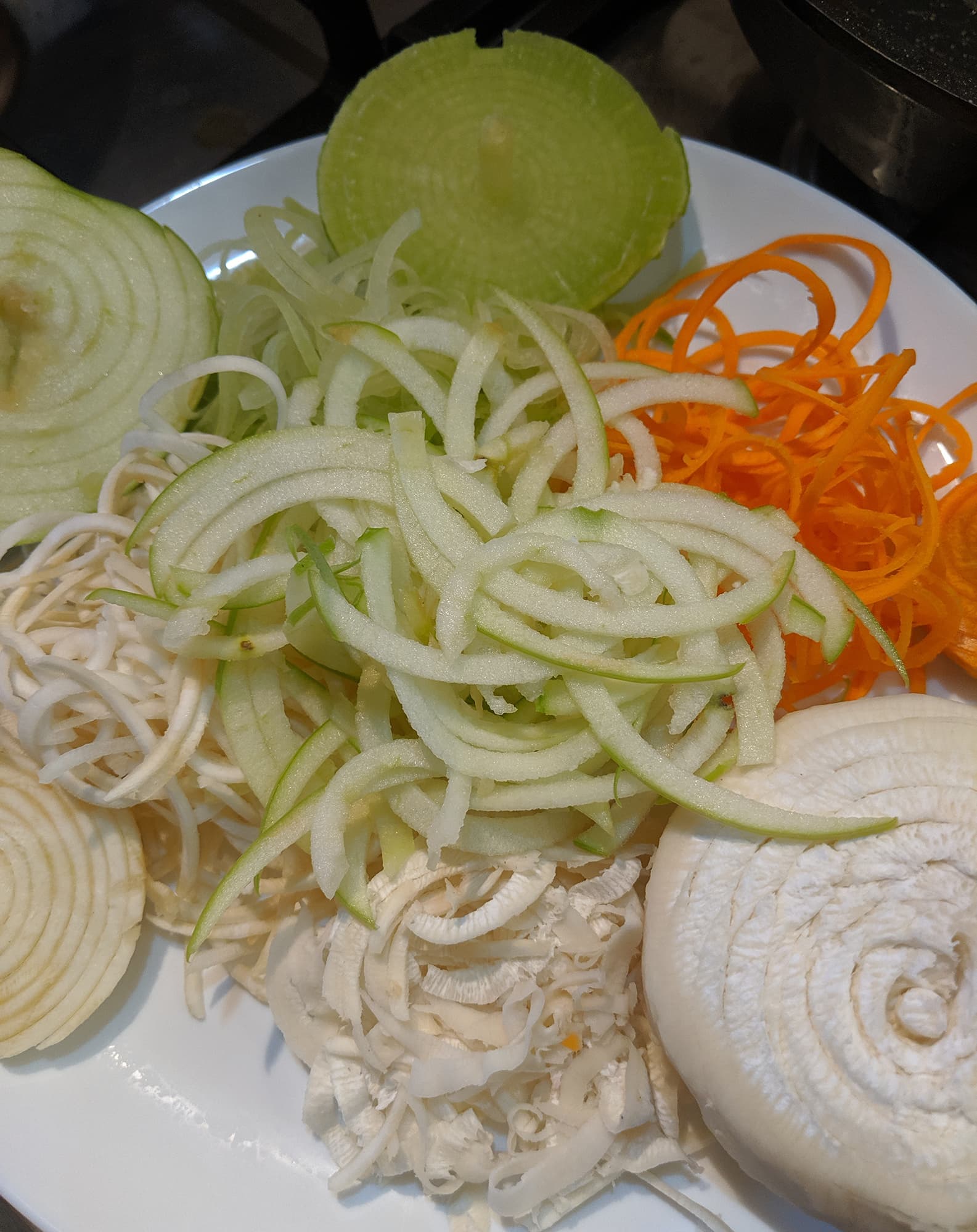 Мы и спиралерезка легко расправились с морковью, дайконом, яблоками и огурцом. Чуть труднее пошел корневой сельдерей: уж больно он волокнистый. Но ничего, справились как-то. Вот редька и репа оказались слишком дряблыми, а капусту и вовсе на спиралерезке не зафиксировать. Капусту нарезали ножом, редьку и репу, а также мелкие остатки остальных продуктов натерли на терке.