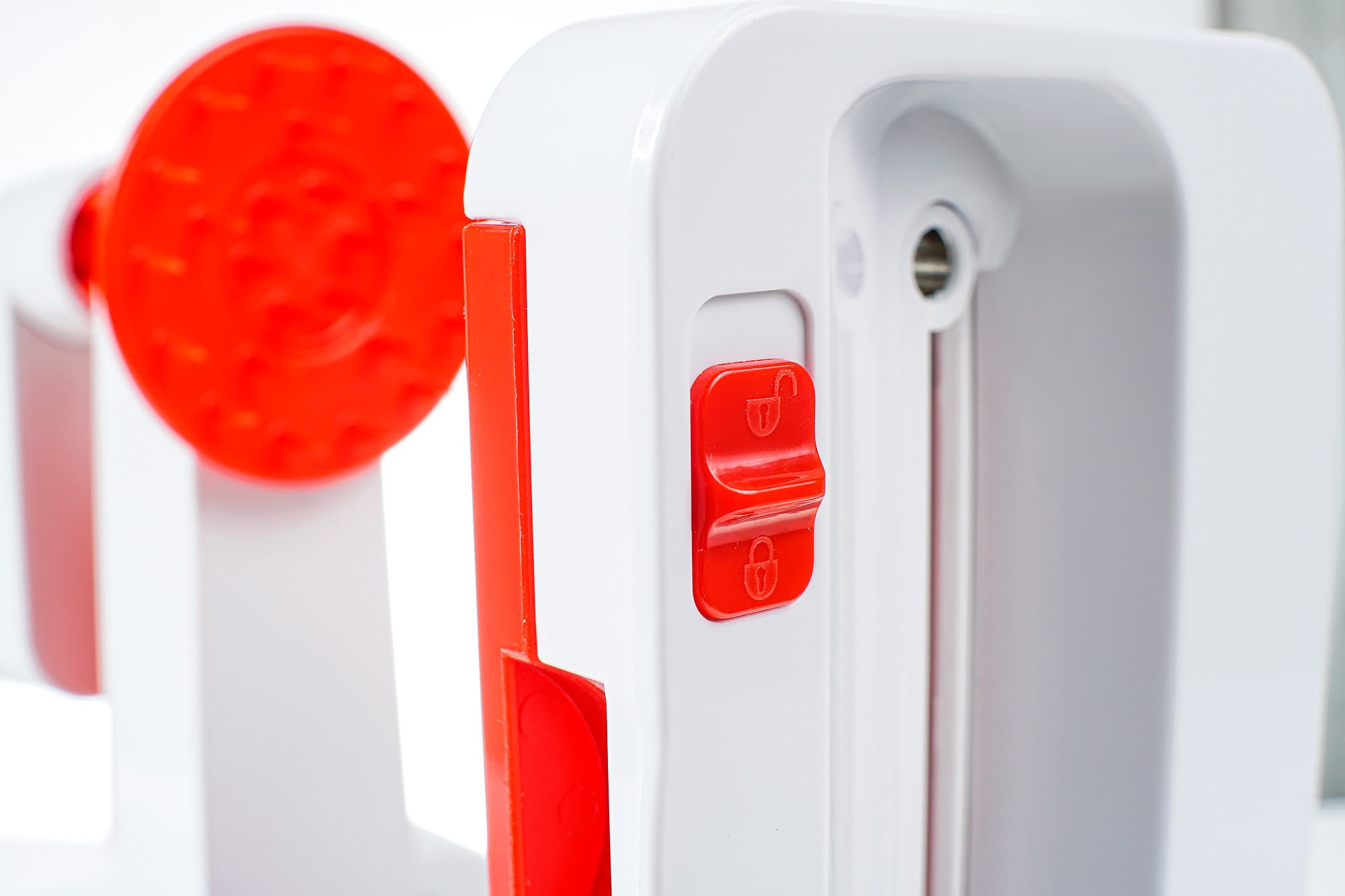 На одной из боковых сторон у ножевой панели есть вторая защелка, которая фиксирует встроенное лезвие в трех положениях: закрытое (безопасное, используется вместе с заглушкой для хранения и транспортировки), среднее (тонкая нарезка) и открытое (более толстая нарезка). Без дополнительных приспособлений ножевая панель режет овощи широкой лентой (потоньше или потолще, в зависимости от того, как открыта защелка).