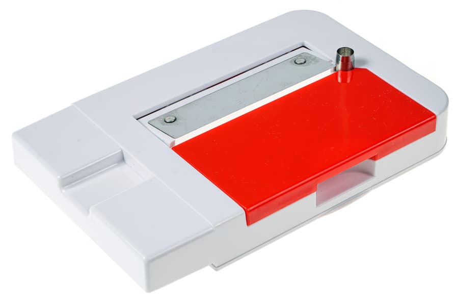 Очень полезная часть основания — держатель для сменных ножей на дне. Ножи вставляются в него лезвиями друг к другу и извлекаются довольно легко. А вот чтобы вставить их обратно, надо обратить внимание на красные стрелочки около входного отверстия держателя. Острия стрелки указывают на то, в какую прорезь надо вставить нож, а то, что вставлять его надо лезвиями вверх, познается с опытом.