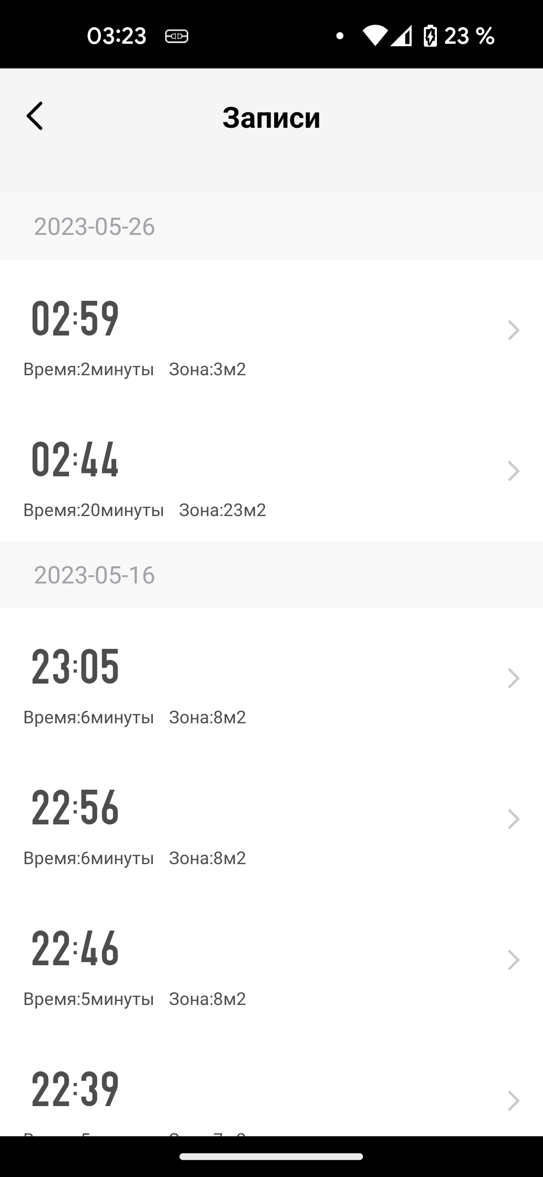 В журнале уборок хранятся данные о последних запусках робота: время старта, продолжительность работы, обработанная площадь и пройденный маршрут.