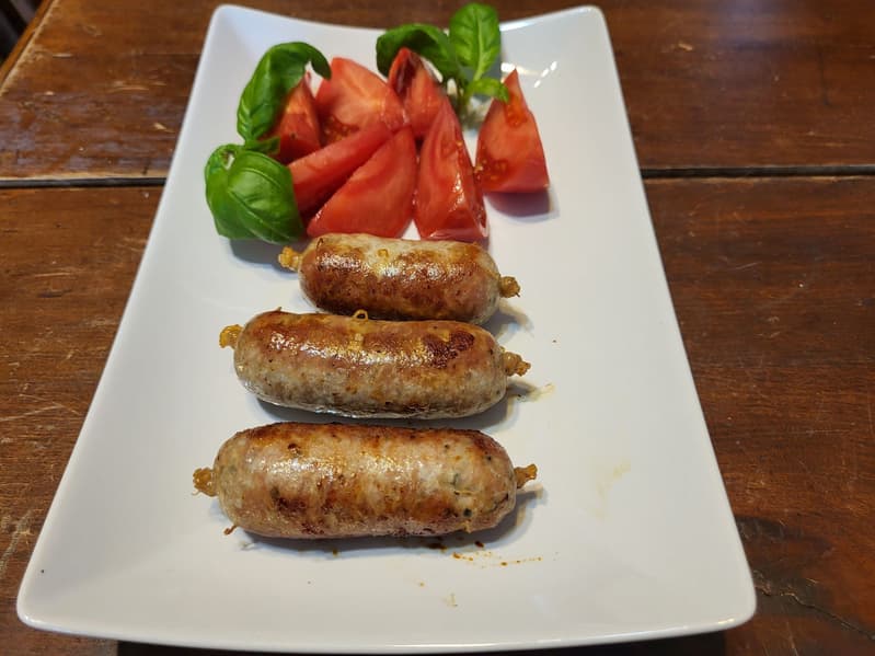 Тем не менее, плотность и равномерность колбасы легко откорректировать при завязывании хвостиков: просто пальцами равномерно распределить фарш. Черева при этом не рвется, что приятно.