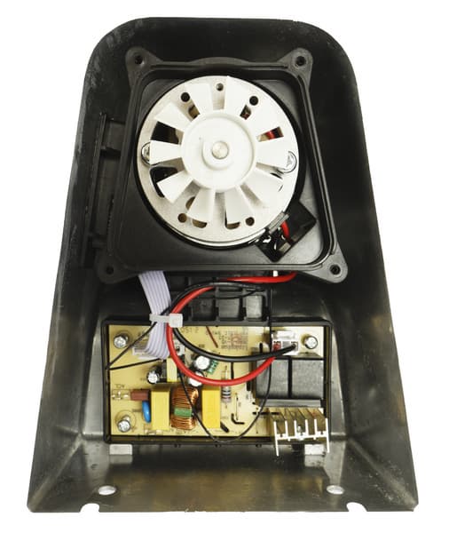 Когда мы рассмотрели все, что входило в коробку с мясорубкой, мы решили посмотреть, что у нее внутри, и обнаружили вентилятор, решетку которого мы видели выше, и электронную плату, обеспечивающую управление мясорубкой.