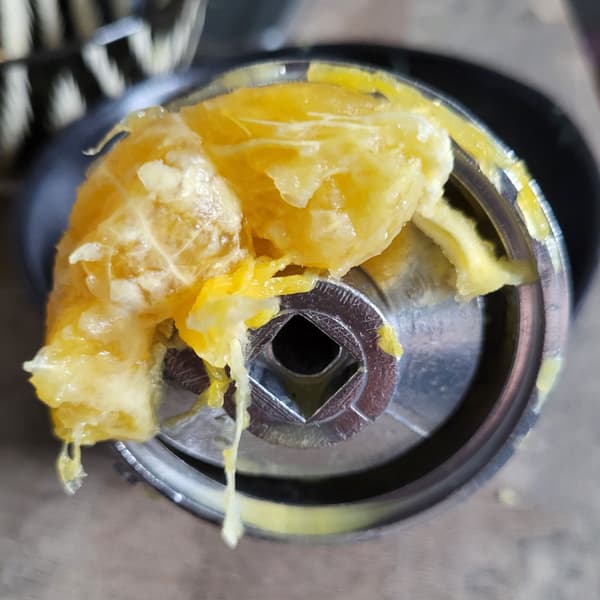 Сложнее было с внутренностью блока соковыжималки. На фото мы видим довольно много жмыха, вынимать который нам пришлось с помощью палочки для суши, и даже это было непросто. Жмых внутри спрессован и лежит довольно плотно. Выход жмыха можно регулировать с помощью винта на соковыжималке, но мы побоялись, что вместе со жмыхом выльется и весь сок.