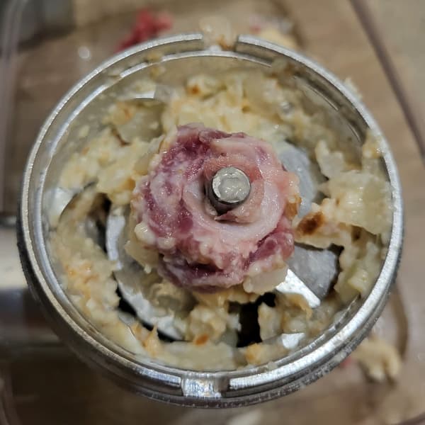 Промололи на мясорубке булку, замоченную в молоке, и лук. За ножом осталось немного мяса, булки и лука.