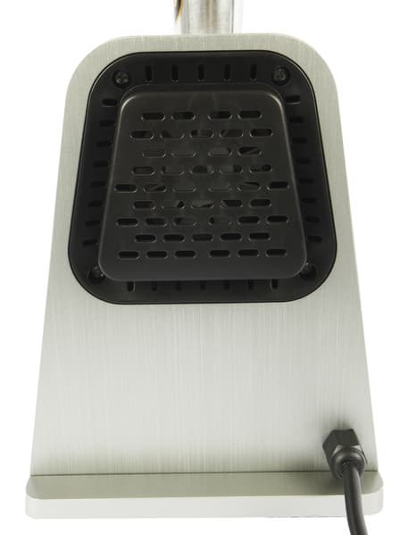 Со стороны, противоположной гнезду для загрузочного блока, находится вентиляционная решетка и шнур электропитания. Присосок снизу для сцепления с поверхностью всего две, но больше и не нужно: мясорубка крепко держится на столе.