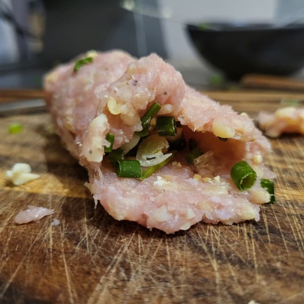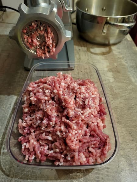 Для приготовления колбасок мы снова смололи фарш в мясорубке.
