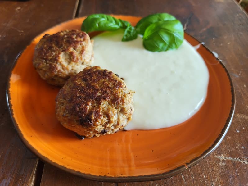 Далее мы пошли обычным путем: перемешали фарш еще раз, сформовали котлеты и пожарили их на сковородке. Пока котлеты жарились, мы сделали картофельное пюре, а потом съели и котлеты, и пюре.