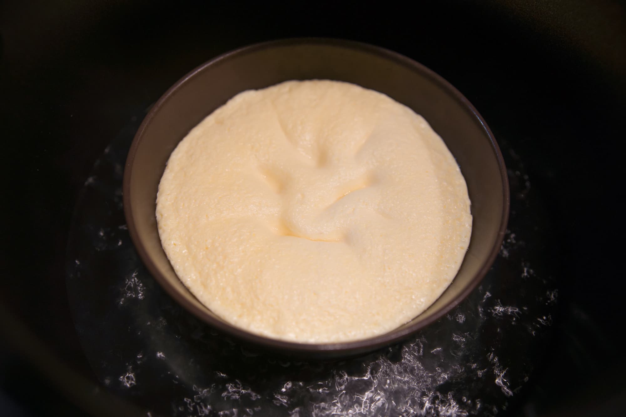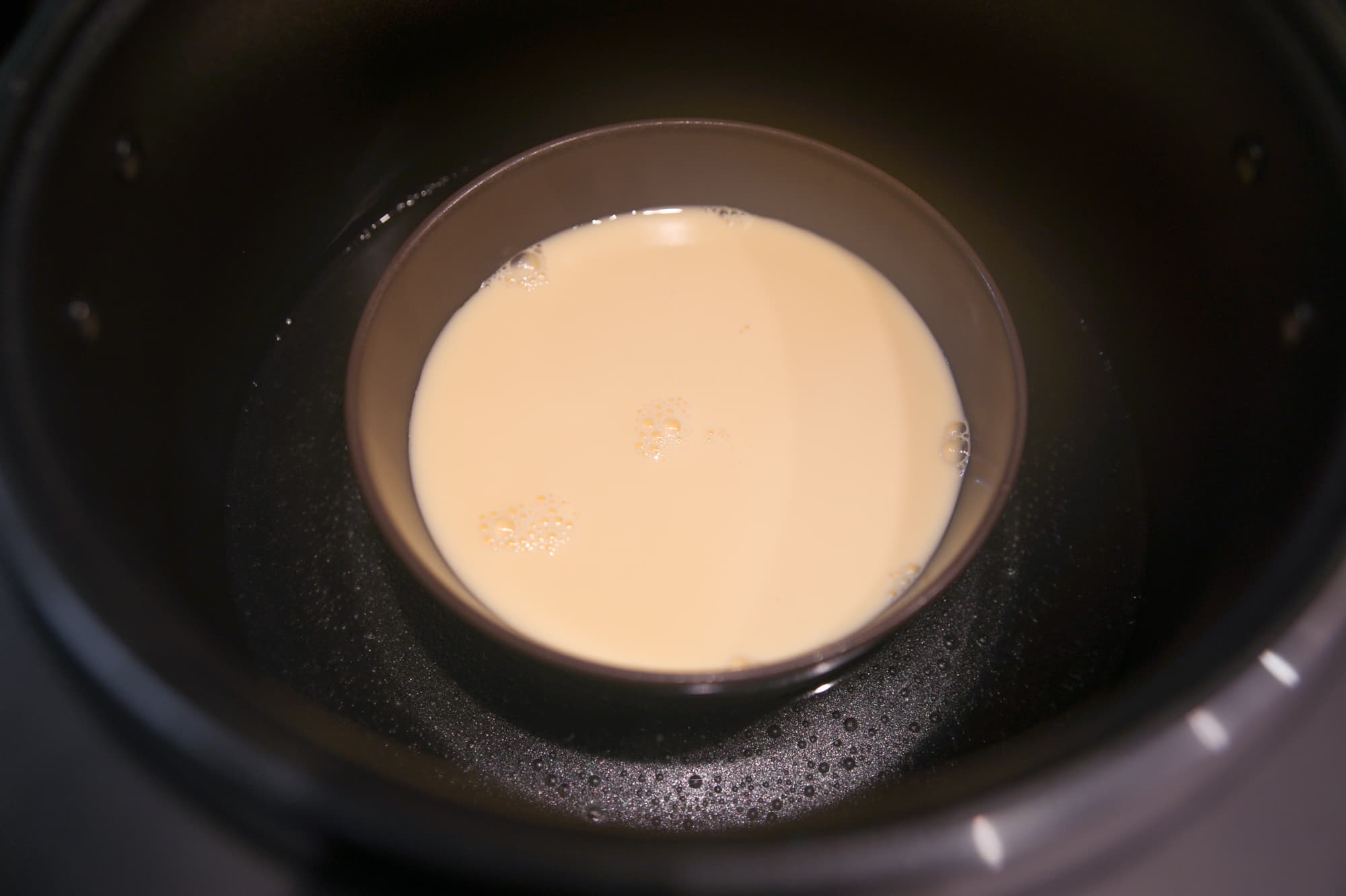 В чашу налили один литр воды, поставили на дно пиалу из жаропрочной керамики и установили режим Мультиповар с нагревом до 125 °C. В отдельной емкости смешали три яйца с молоком в количестве равном объему яичной массы. За это время вода в чаше закипела, мы вылили яичную смесь в пиалу и закрыли крышку.