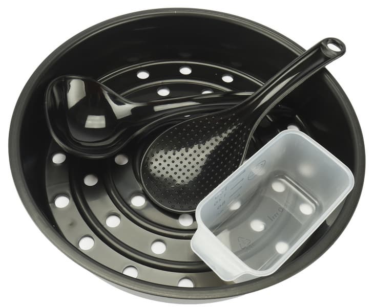 В комплект входят стандартные ложка и черпак, небольшая мерная емкость объемом 180 мл, а для приготовления на пару́ — специальный контейнер.