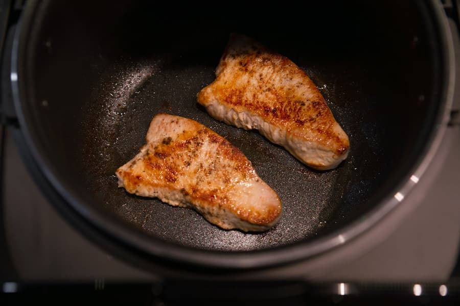 Включили режим Жарка. Через 3 минуты, когда рабочая температура была достигнута, капнули в чашу совсем немного растительного масла и выложили на дно два куска индейки. Температура по умолчанию была 160 °C. Периодически переворачивая стейки, жарили их в течение 10 минут.