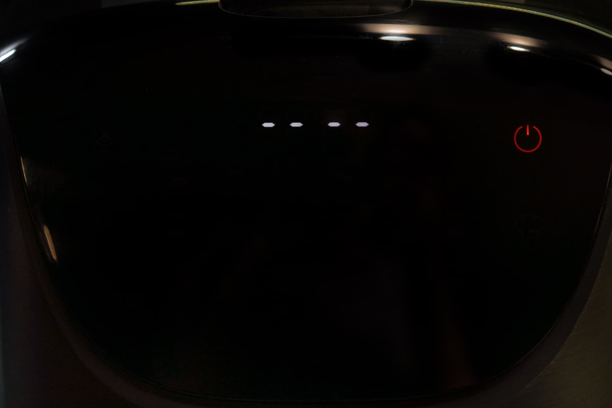 После подключения к сети в правом верхнем углу загорается красная кнопка, включающая основное меню, а в области где позже появится информация о времени готовки и параметрах нагрева появляется пунктирная линия. Там же находится индикатор звуковых сигналов. Звук при желании можно отключить.