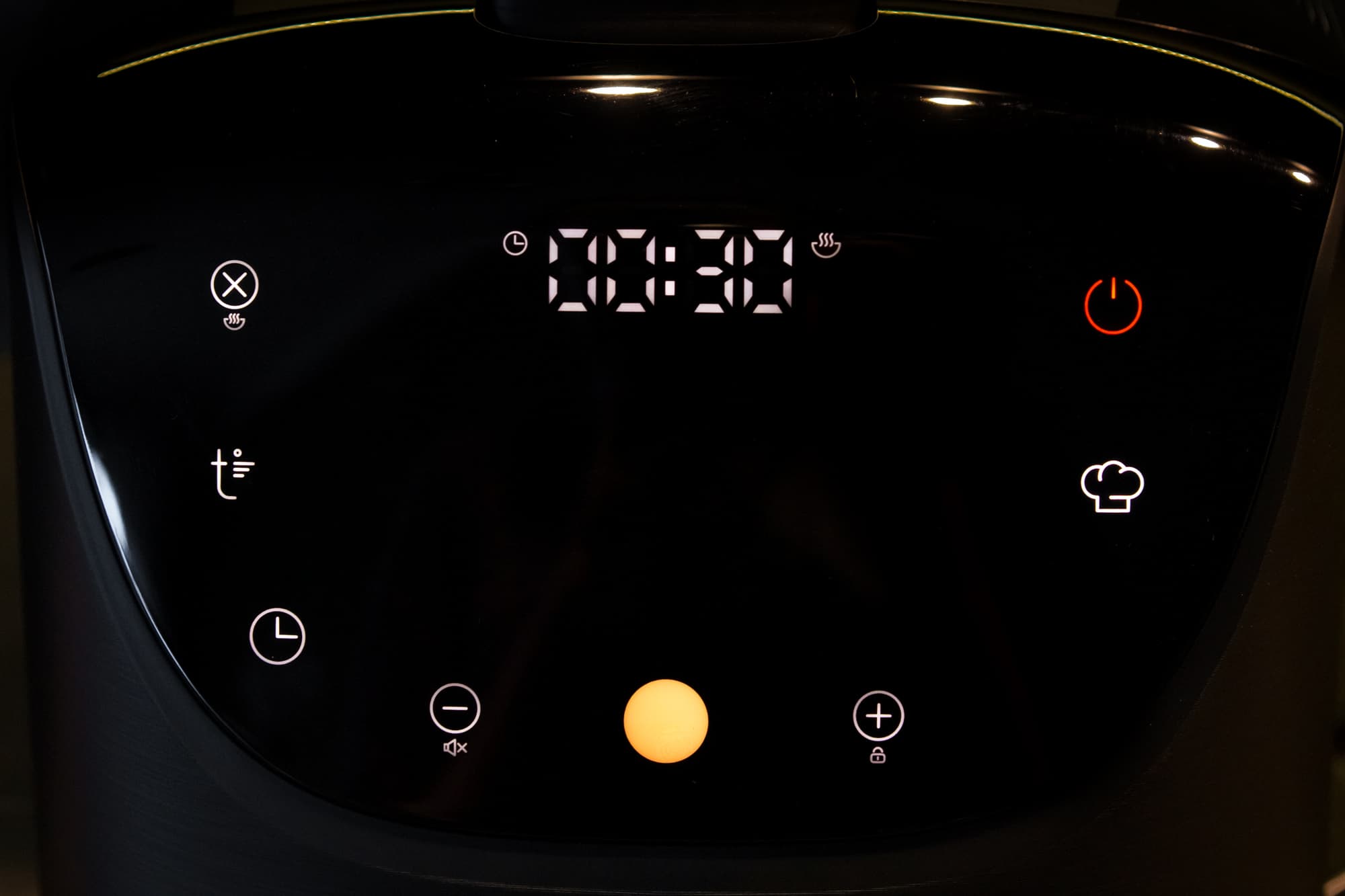 Кнопка в виде поварского колпака справа отвечает за запуск программы Мультиповар. Во всех режимах, кроме Экспресс, предусмотрена корректировка параметров нагрева в диапазоне от 35 до 180 °C с шагом 1 °C, но только в Мультиповаре это значение можно менять до запуска. Во всех остальных режимах температура меняется после, но, с другой стороны, кто мешает сделать это сразу после старта. Чем тогда Мультиповар отличается от других режимов? Ответ: диапазоном изменения параметров времени приготовления. В этом режиме он максимальный — от 1 минуты до 12 часов с шагом 1 минута. Во всех остальных есть ограничения.