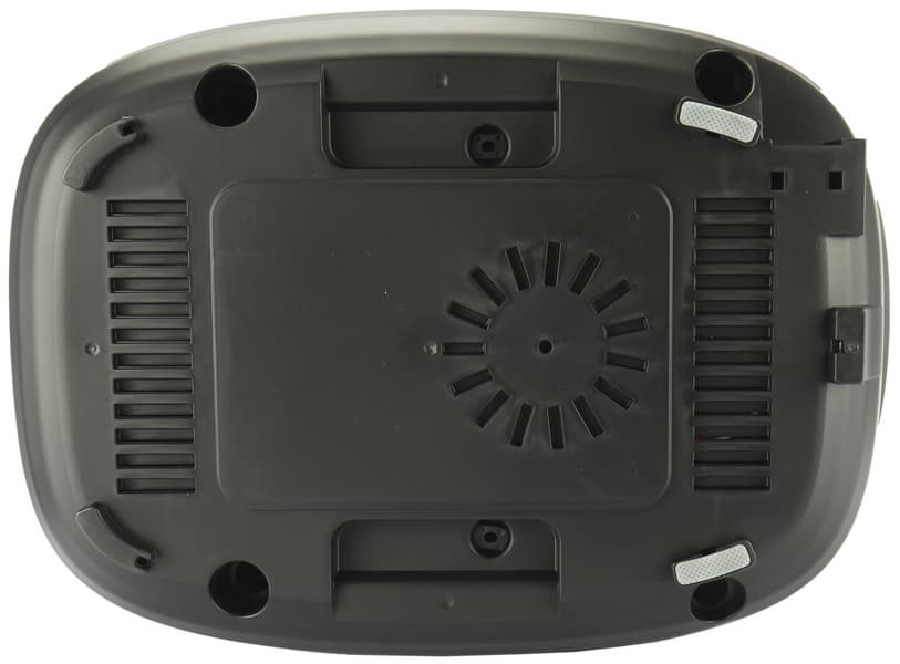 На дне мультиварки вентиляционные прорези и пять ножек в виде выступов, две из которых, в передней части оснащены противоскользящими накладками.