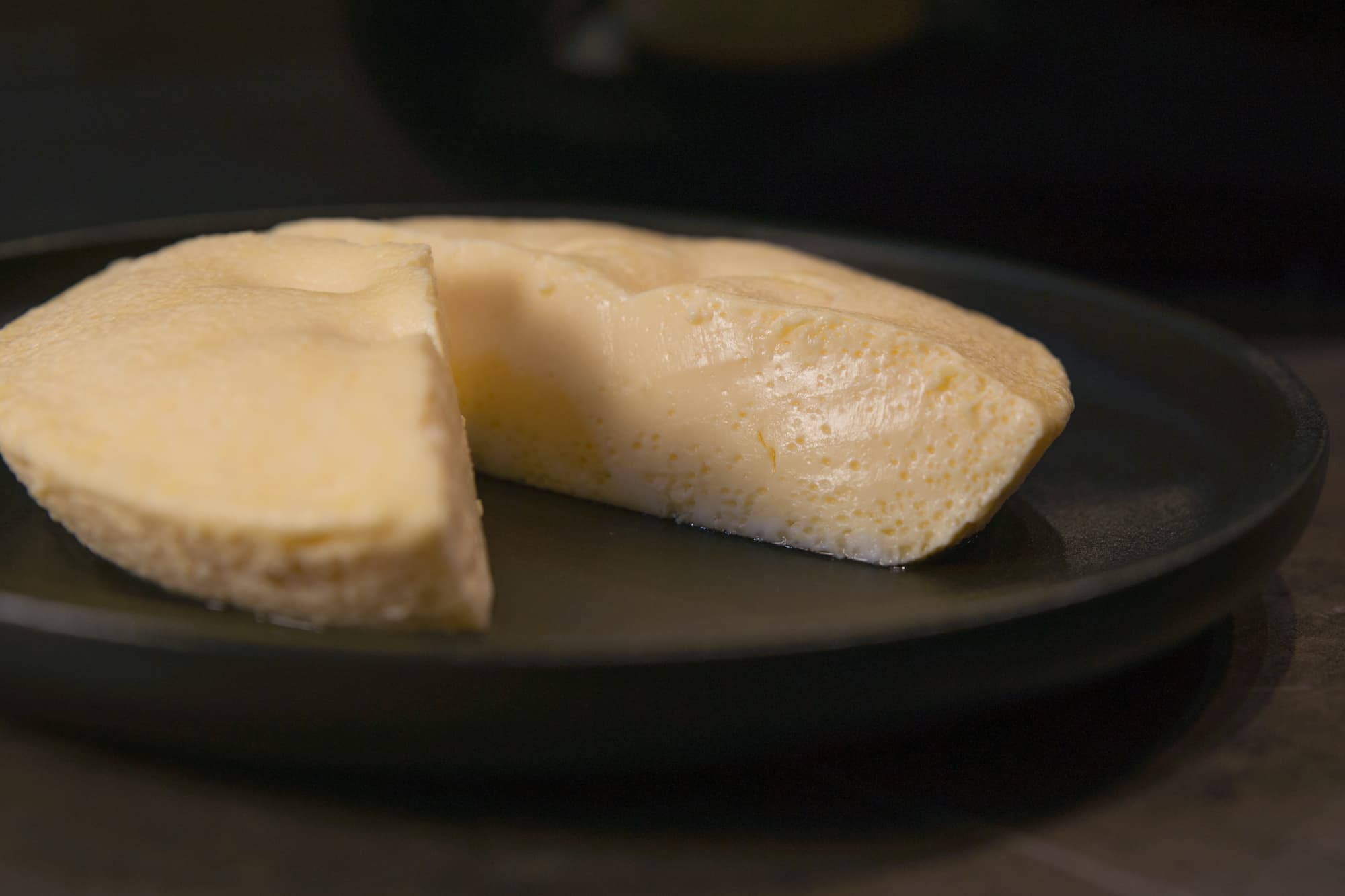 Достали емкость из воды, немного остудили и при помощи силиконовой лопатки аккуратно извлекли омлет на тарелку.